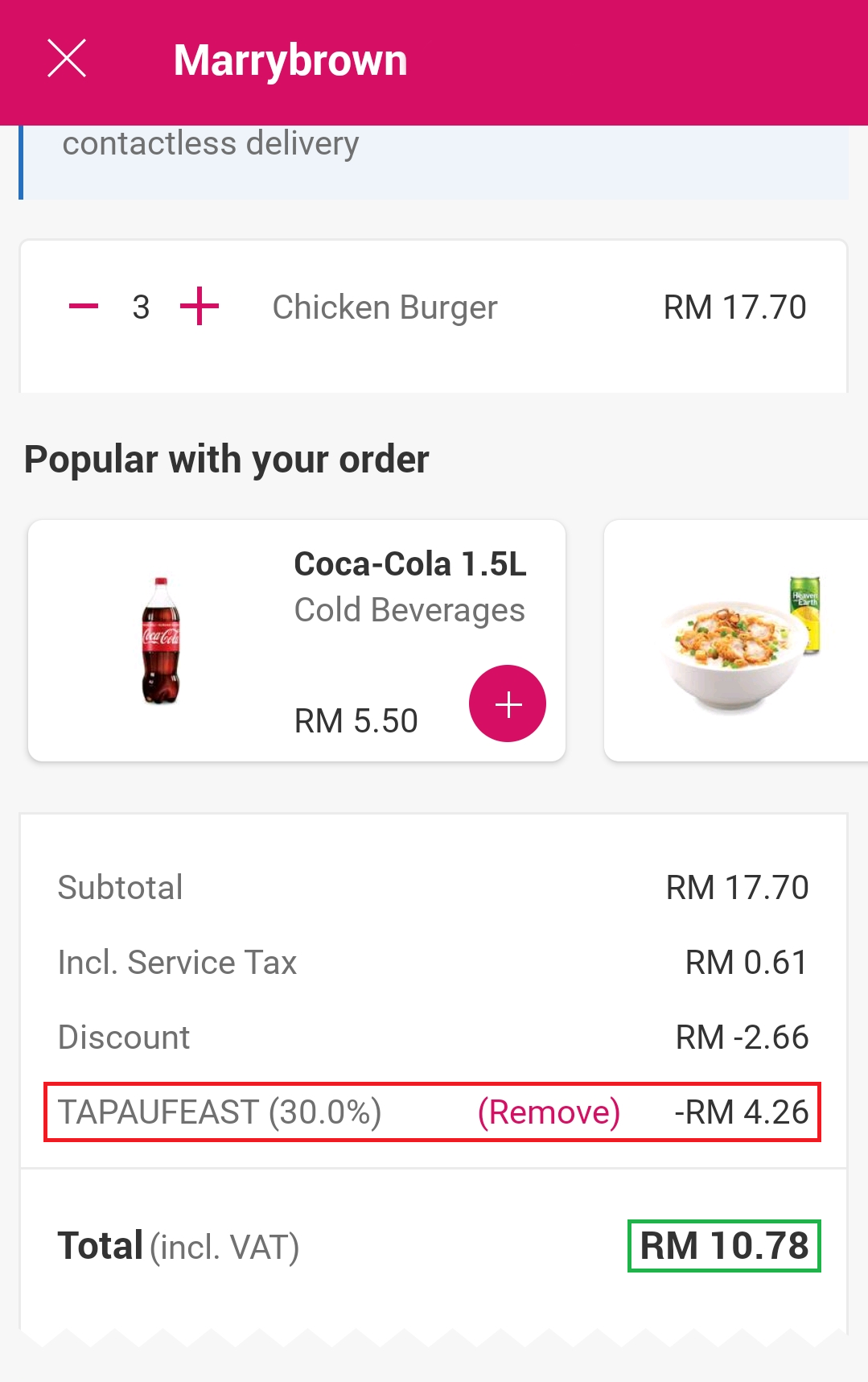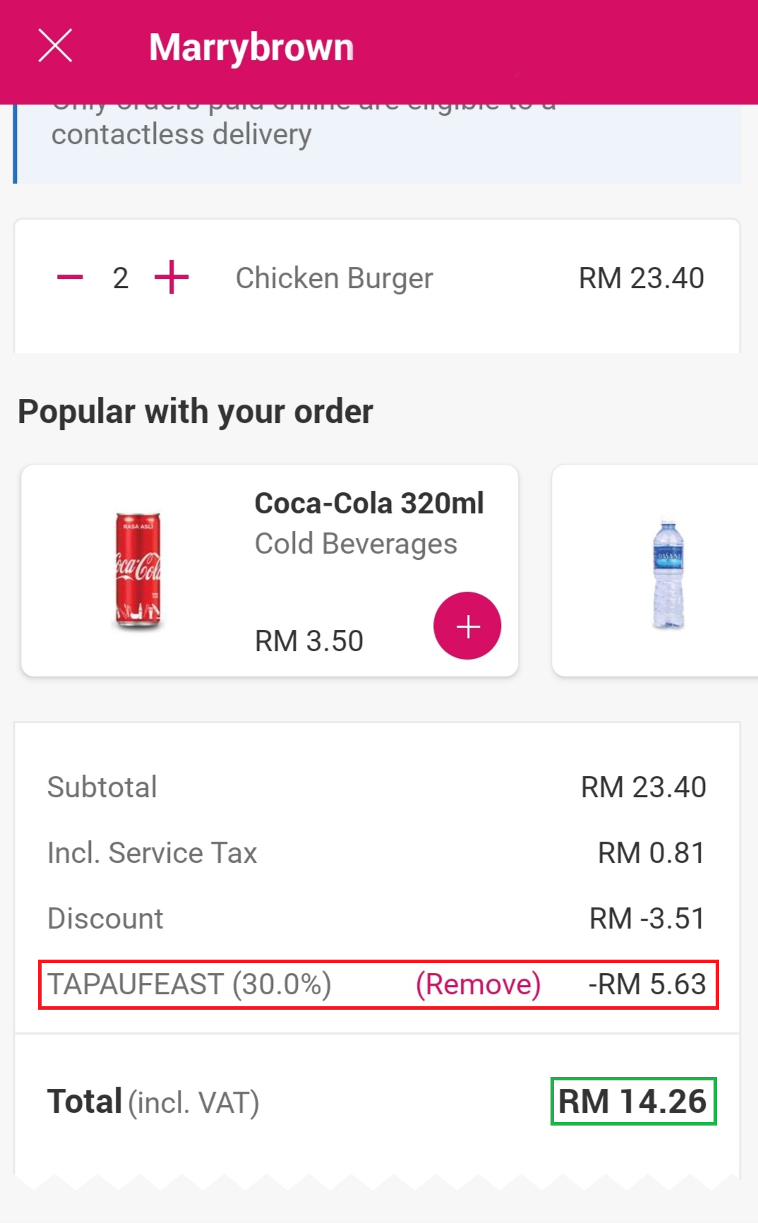▼ 2份Chicken Burger 套餐原价RM23.40,折扣15%Pick-Up+折扣30%【TAPAUFEAST】后只需RM14.26!平均一份汉堡套餐只需RM7.13!