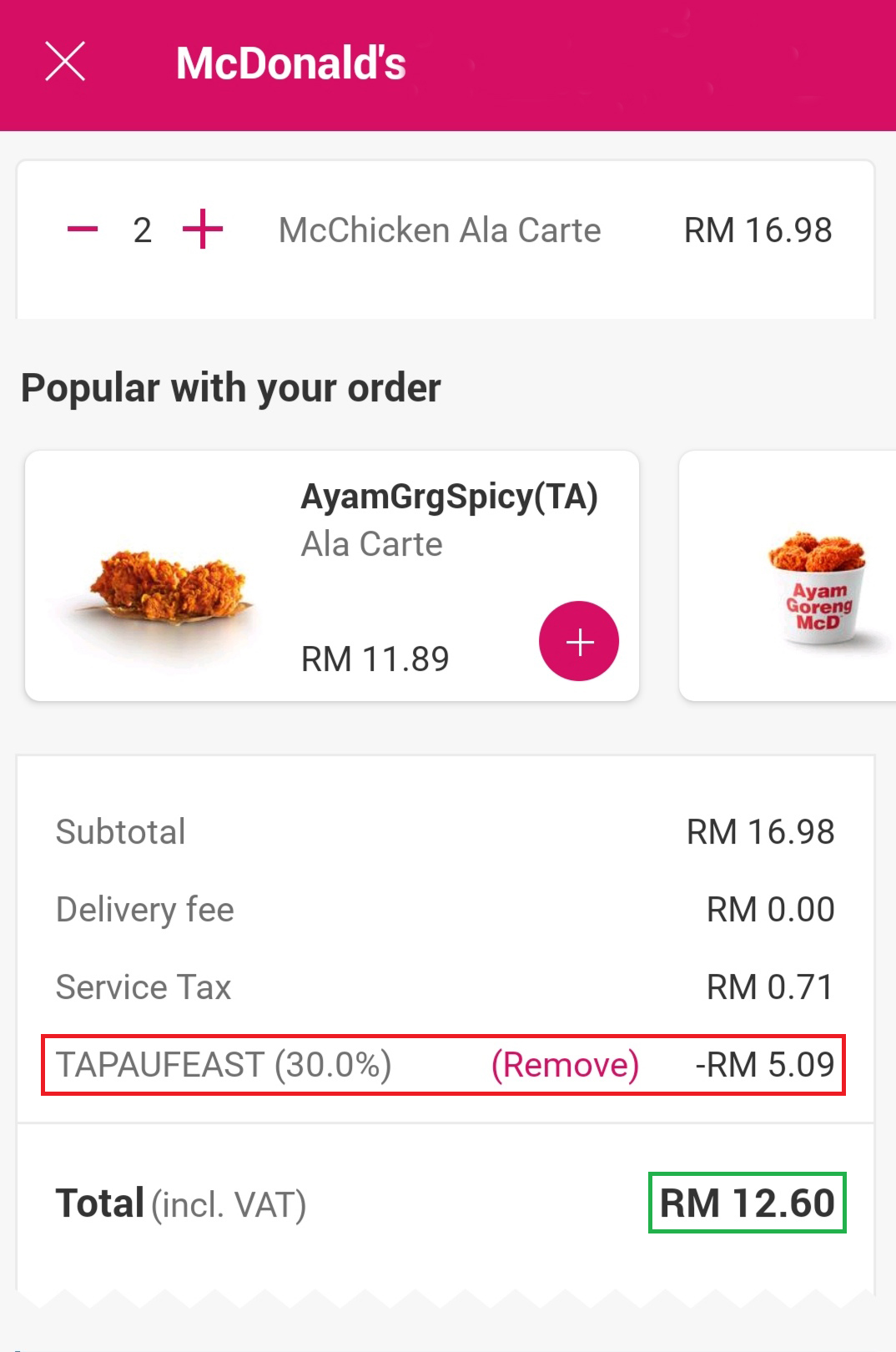 ▼ 2粒McChicken Burger 原价RM16.98,折扣30%【TAPAUFEAST】后只需RM12.60!平均一粒汉堡只需RM6.30!