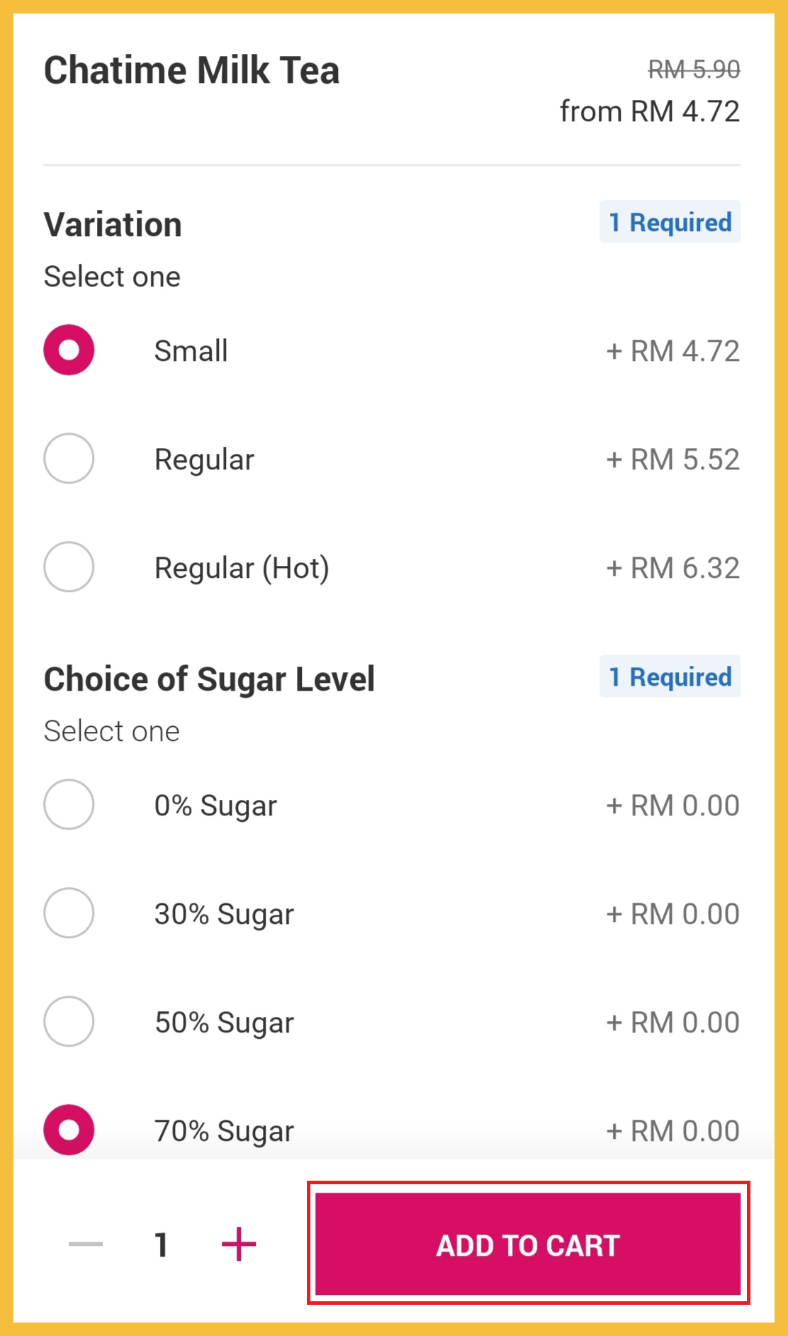 步骤 3:选择你想小/大杯装的饮料及添加任何配料 ,点击「Add To Cart」。