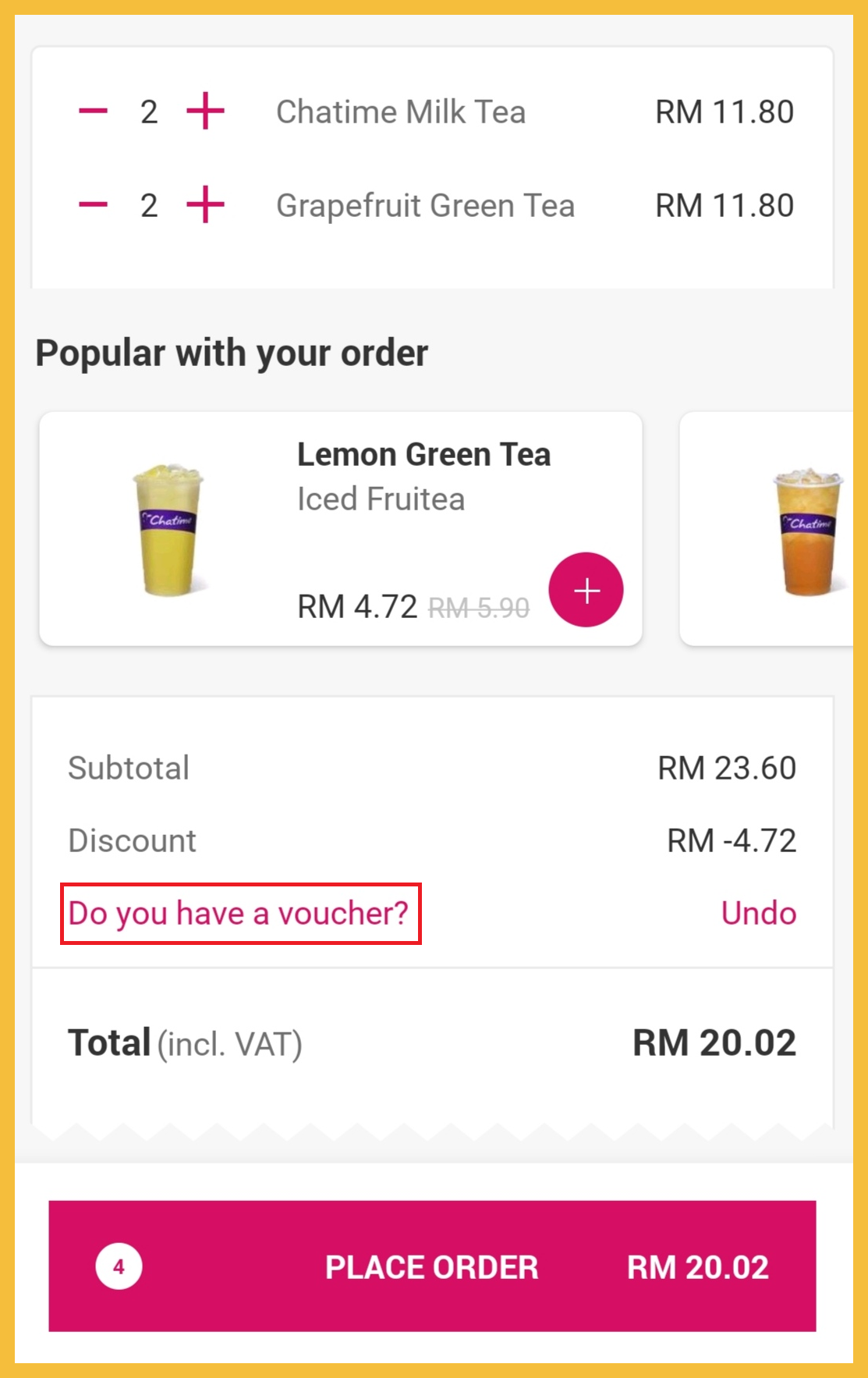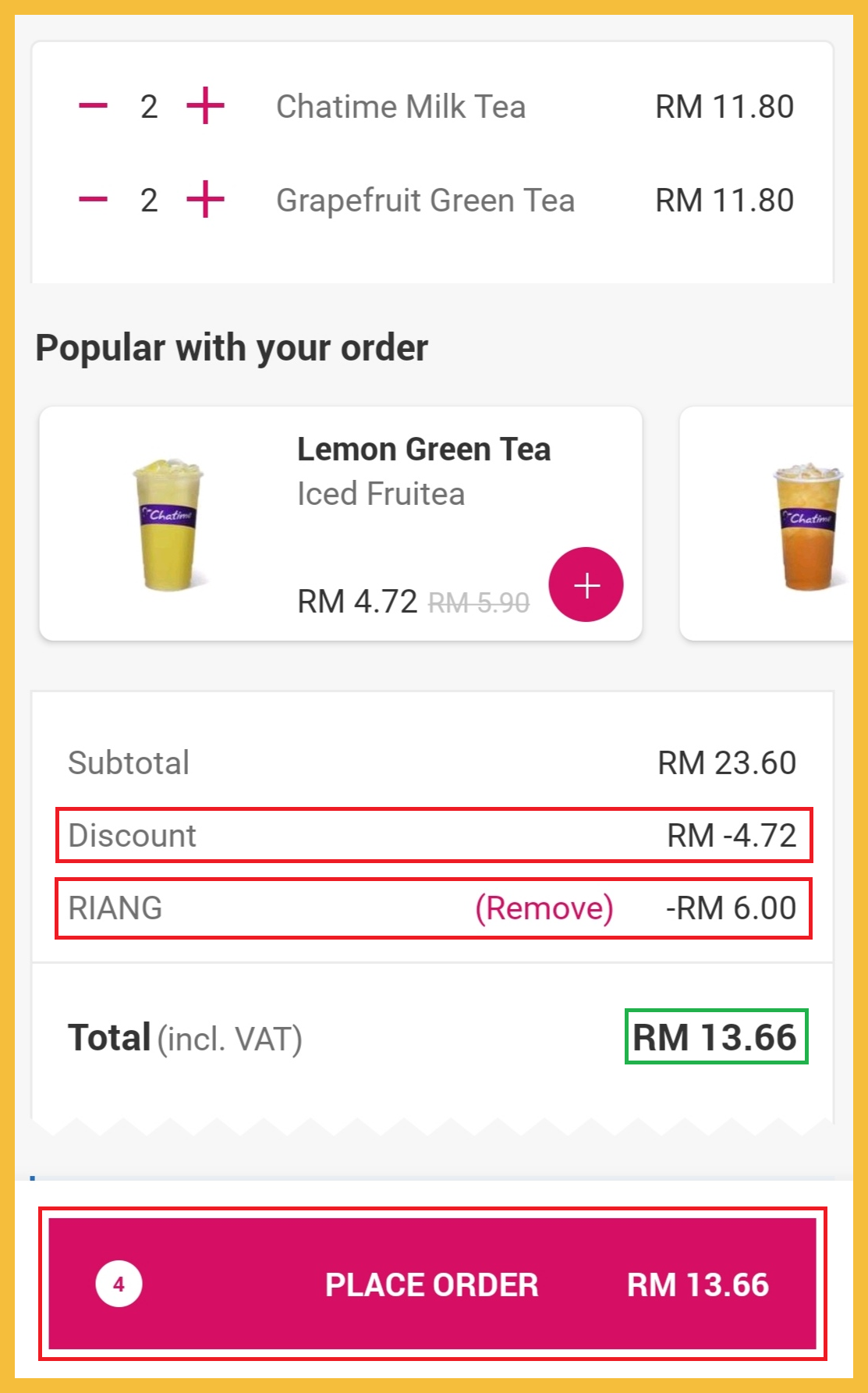 ※ 4杯Chatime 饮料原价RM23.60 折扣Pick Up 20%+【RIANG】RM6后,只需RM13.66!平均一杯只需RM3.42!
