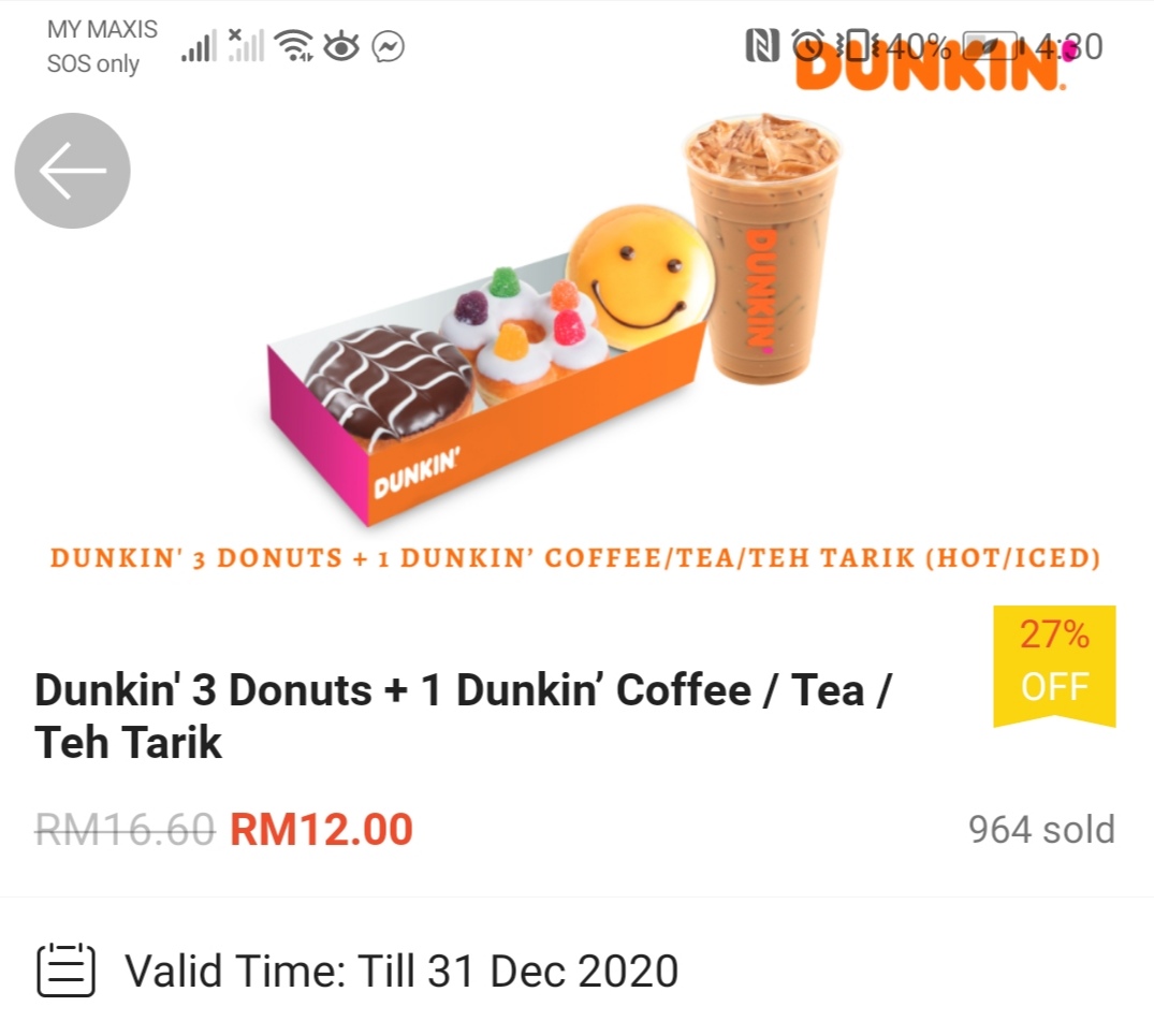 ▼④ Dunkin’ 3 Donut + 1 Dunkin’ Coffee/Tea/Teh Tarik —— 只需RM12(原价RM16.60)