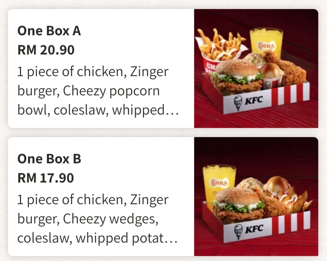 ① 第一种The One Box 包含:Zinger Burger、炸鸡、马铃薯泥、沙拉、Cheezy Popcorn Bowl及Sjora Mangga Ria 饮料。