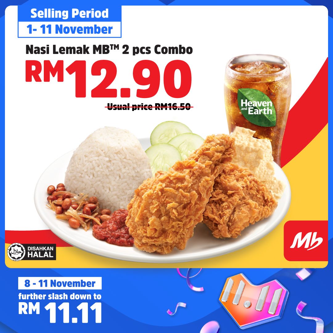还有2天就要迎接11月份了!大马Marrybrown 将推出一连串美食优惠给大家!鸡肉汉堡只需RM3.90,2块炸鸡的Nasi Lemak 只需RM12.90!