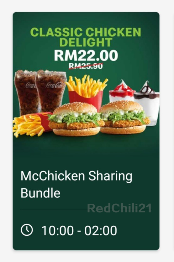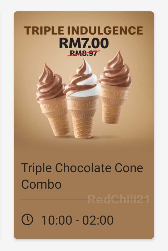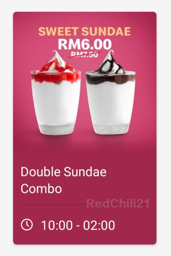 只要你通过McD App 就能买到便宜的Hershey’s巧克力雪糕及其他汉堡套餐!2份McChicken 汉堡套餐+2杯Sundae 只需RM22,平均一份只需RM11!
