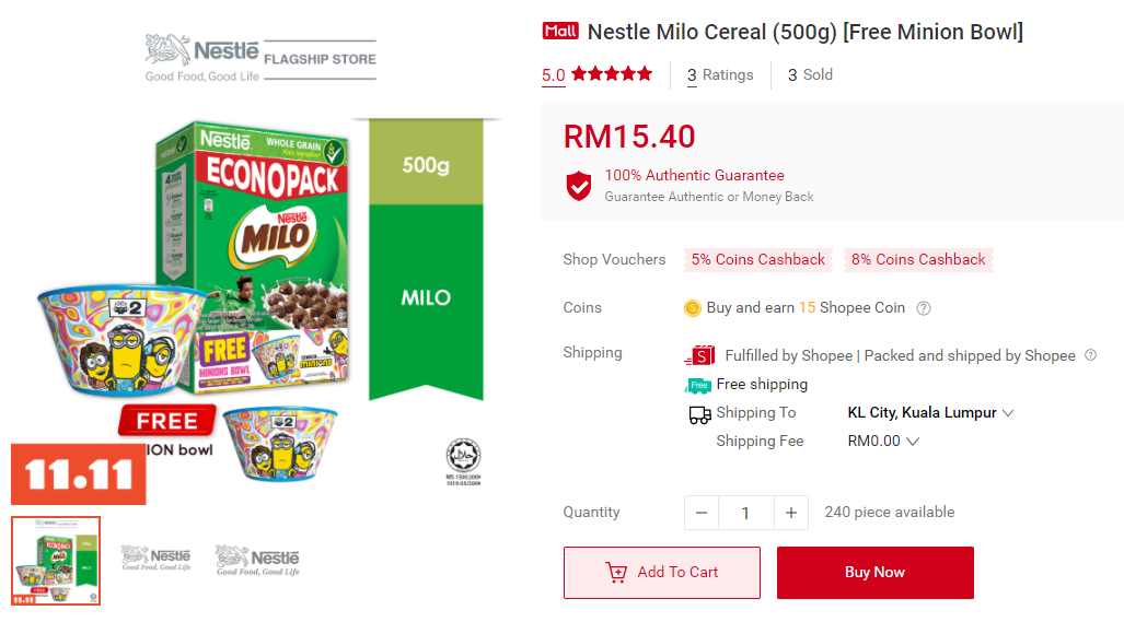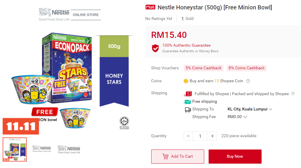 那要去哪里才能购买才能获得这款Minion 呢?!如今你可在大马网购平台Shopee 购买到!不过只限Honeystar 和Milo Cereal 而已哦!