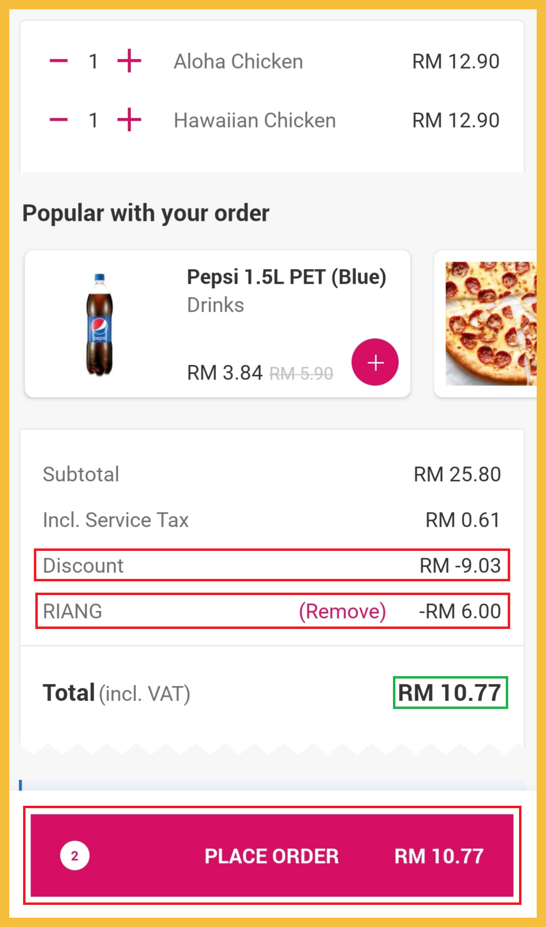 ▼ 2份Personal Pizza 原价RM25.80,折扣35%+【RIANG】RM6后,只需RM10.77!平均一份Personal Pizza 只需RM5.38!