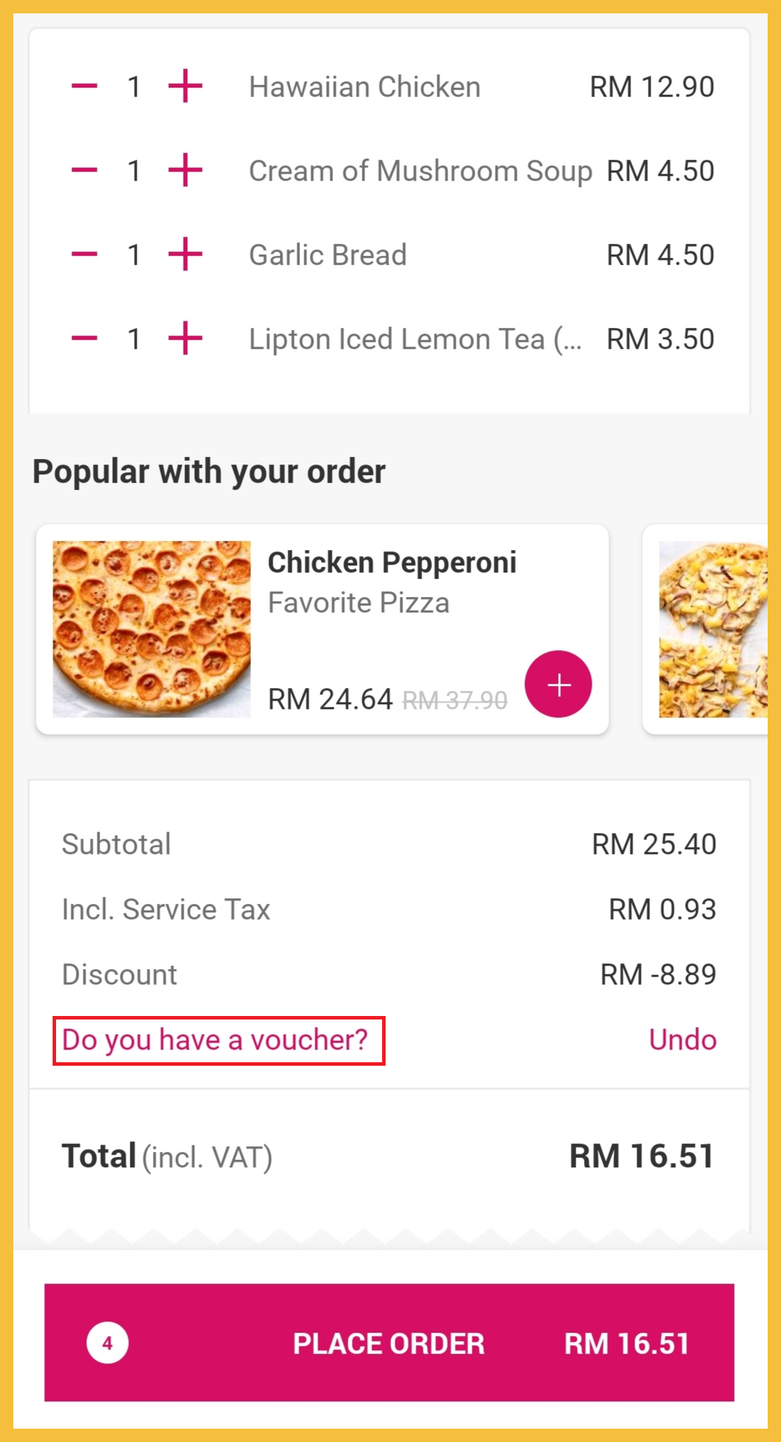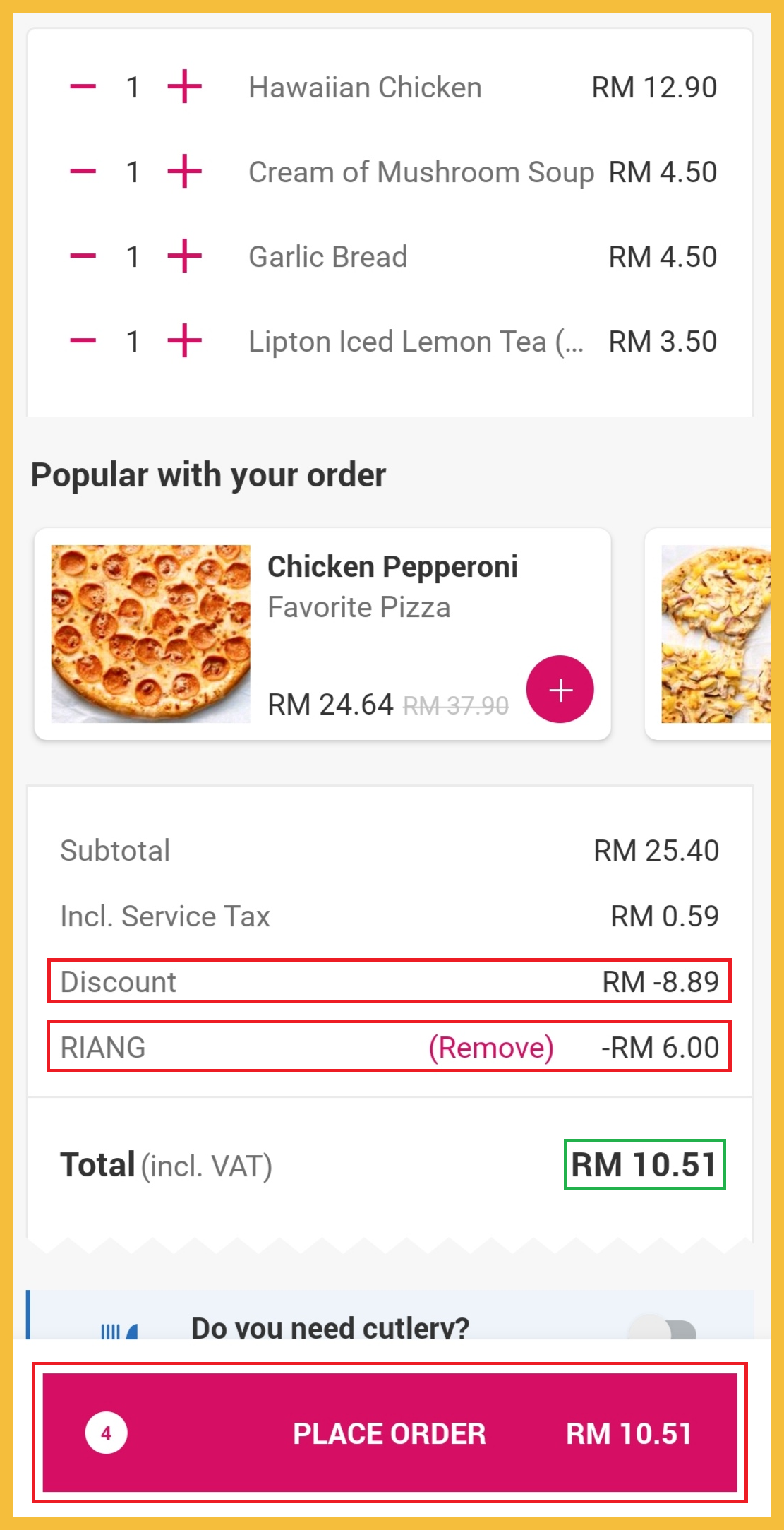 ※ 1份Personal Pizza+ 蘑菇汤+ 蒜蓉面包+ 汽水原价RM25.40,折扣35%+【RIANG】RM6 后,只需RM10.51!