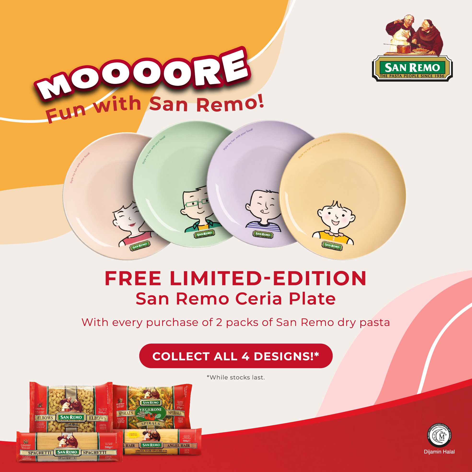 只要你购买2包Dry Pasta 就可免费获得一个陶瓷盘子!而且每一款盘子都代表家庭成员的角色哦!