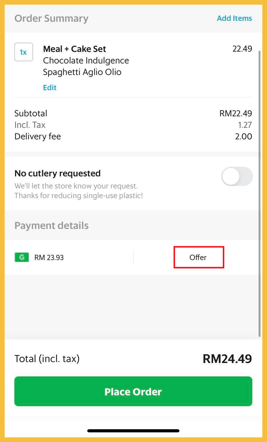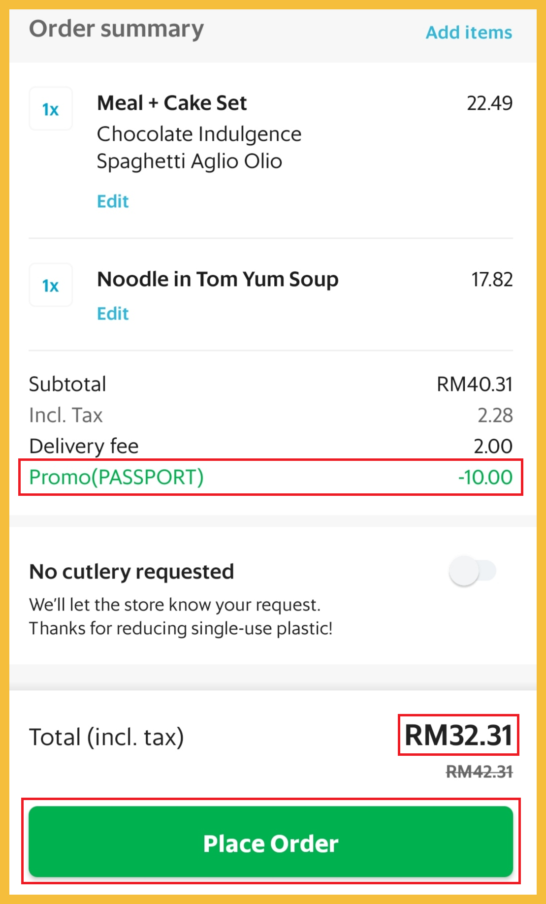 ※ 小编是订购1份Meal +Cake 套餐和一份Noodles In Tom Yum Soup 折扣RM10之后,只需RM32.31(原价RM40.31)!