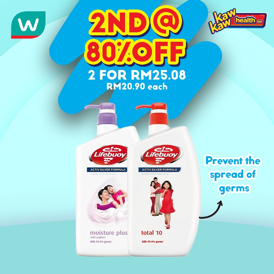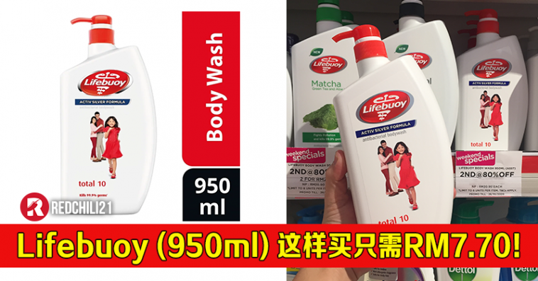 通过这个第2样商品80%的折扣优惠,2瓶装Lifebuoy (950ml)只需RM25.08 ,那么1瓶只需RM12.54!