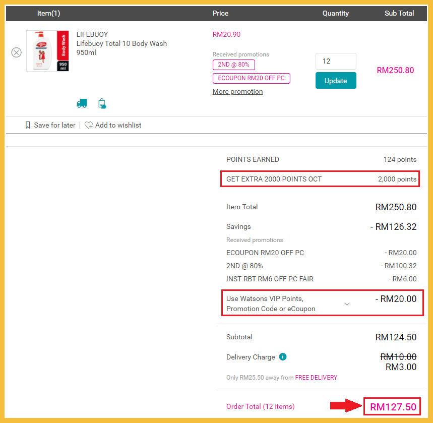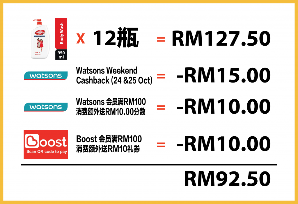 ▼达到所有现金的回扣条件后,那么12瓶950ml 的Lifebuoy 只需RM92.50,1瓶算起来只需大约RM7.70还包送到家里!