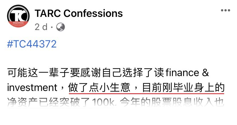 可能这一辈子要感谢自己选择了读 finance & investment(金融与投资),做了点小生意。目前刚毕业,身上的净资产已经突破了RM100K。今年的股票股息收入也突破 RM2K,当作是每年为自己加薪了。