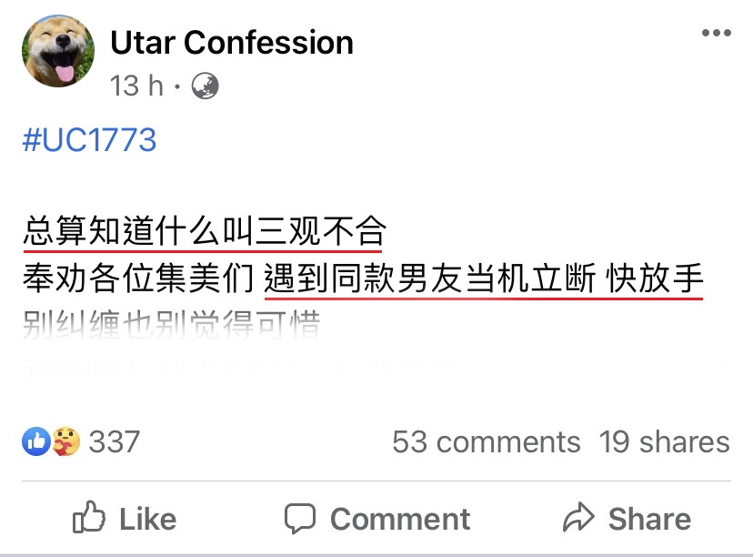 一名大马女网友日前在“Utar Confession”分享自己和前男友的故事,她列出了8件曾发生过的“趣事”,从中可看出前男友的三观与她大有不同,于是决定分手收场!