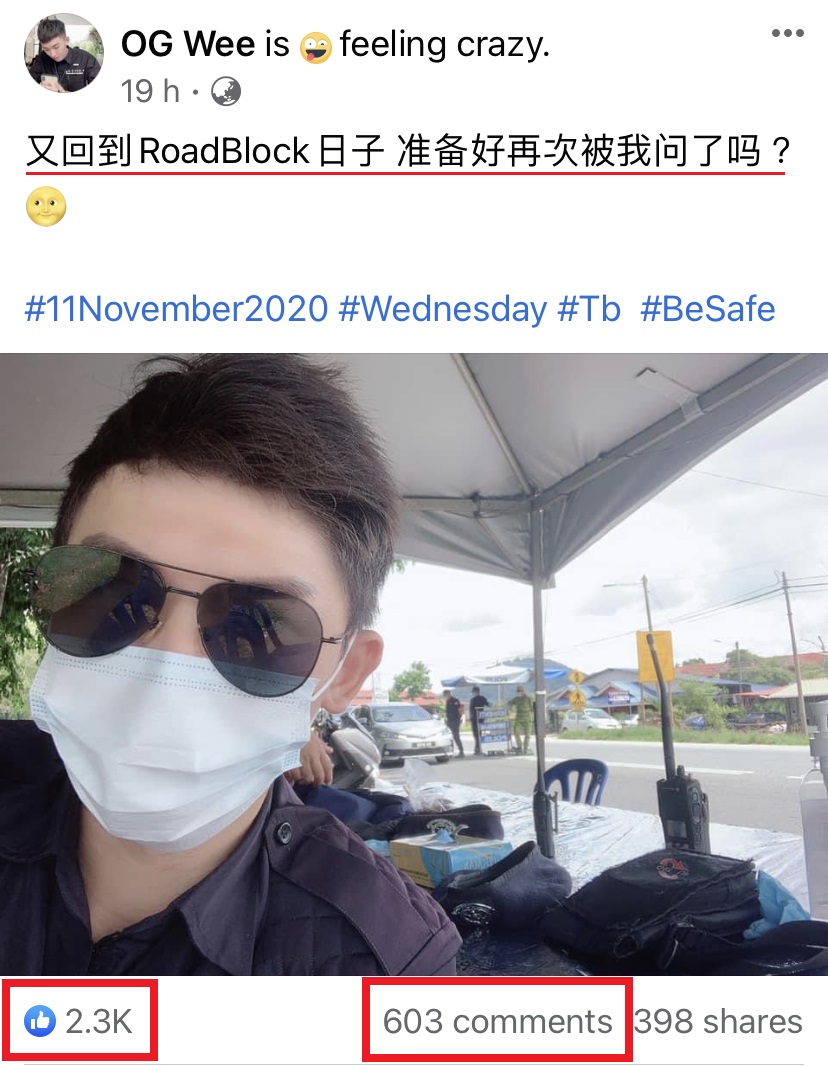 时隔半年多以后,如今大马的新冠疫情再次卷土重来,而小鲜肉警察 OG Wee 也于昨天在面子书更新了动态,一张在执行路障的照片竟然再次成为网民的热议!
