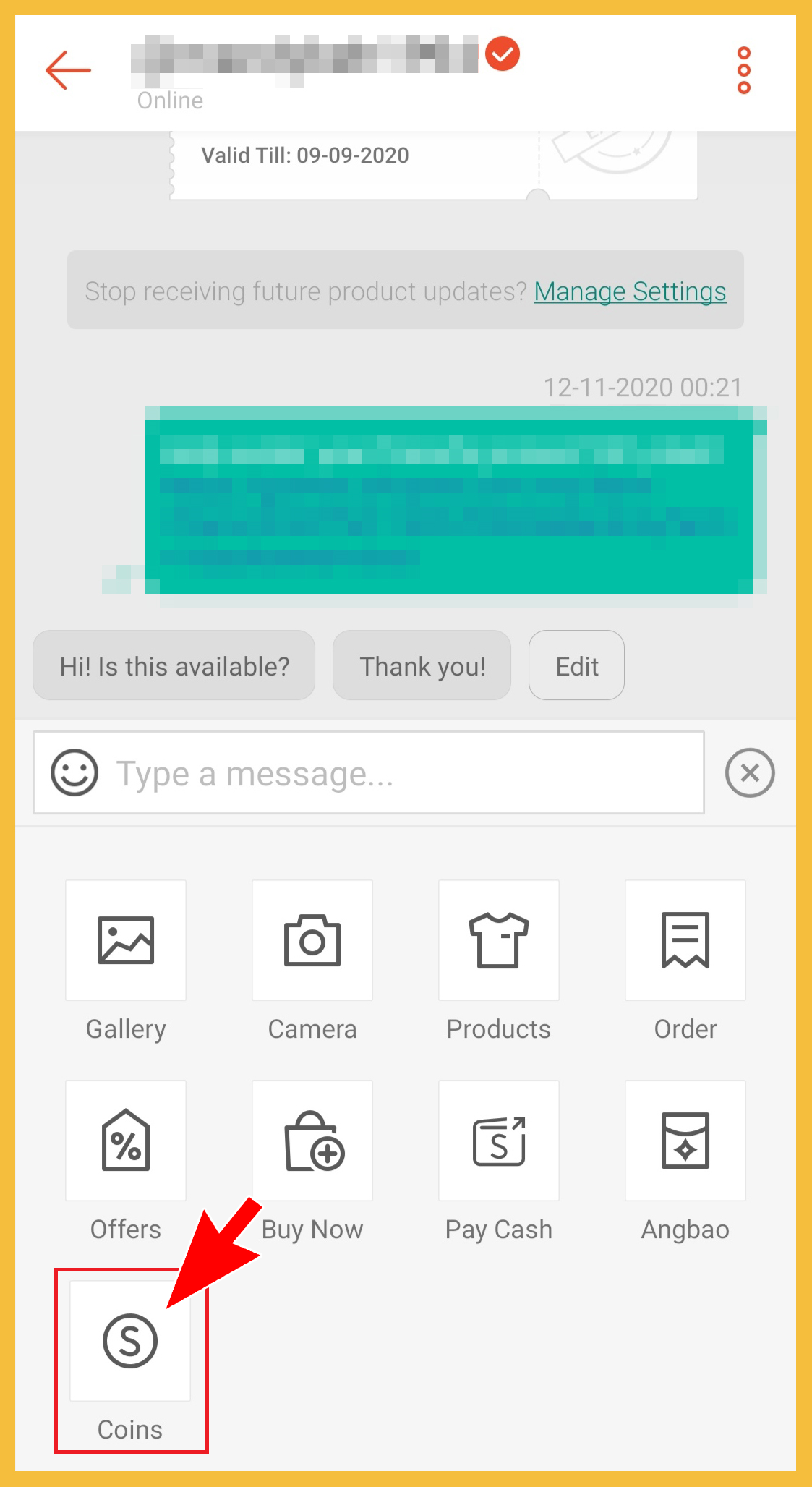 ▼ 步骤1:在Shopee 系统内打开聊天信息,选择你想转发Coins 的用户!