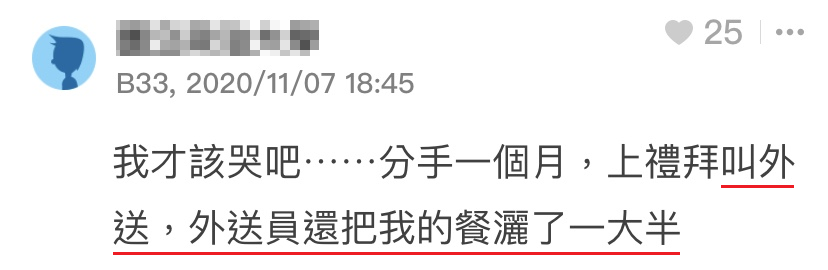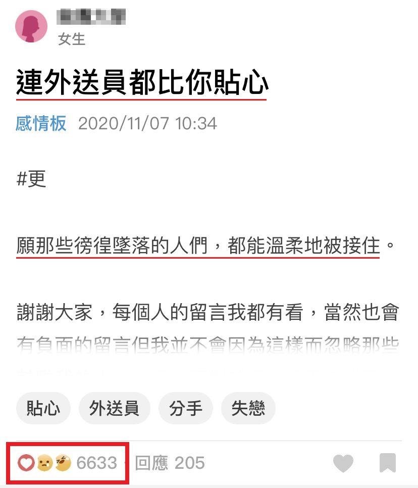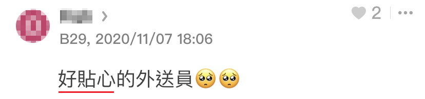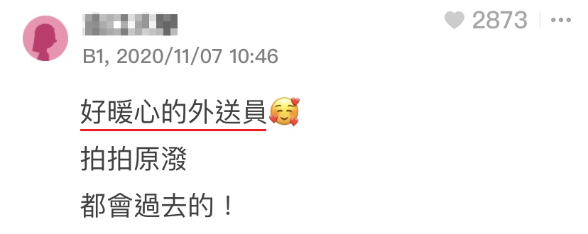 近日,一名台湾女网友在 Dcard 发帖分享一件很温暖的事,因失恋而伤心欲绝的她,没想到在点外卖的时候遇到超暖心的外送员,简单的一句话却足以她感动得爆哭!