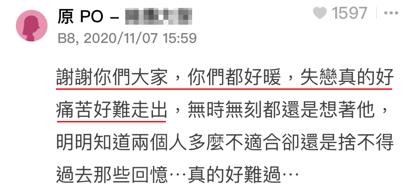 没有谁对谁错,我希望看不惯这些作法的人能同理心一下不要口出恶言,因为不管是我,或是其他正在经历失恋痛苦的人,都已经脆弱的无法承受更多的伤了。