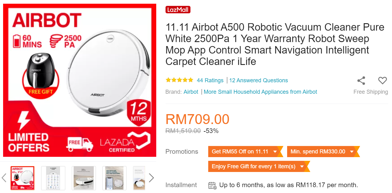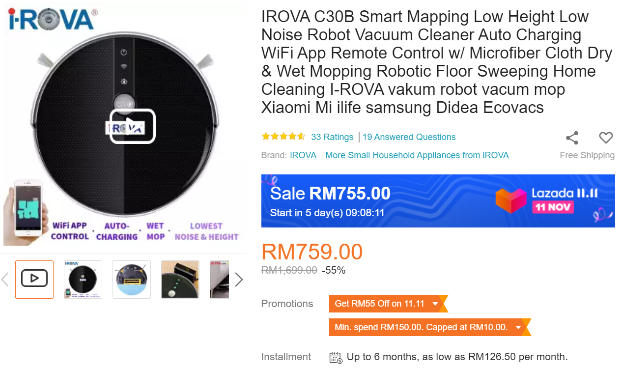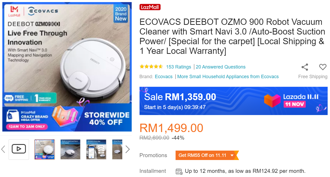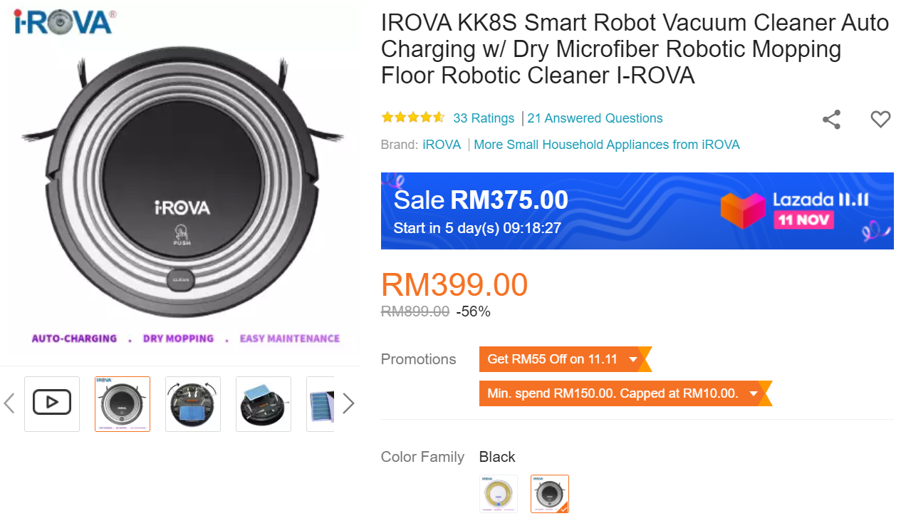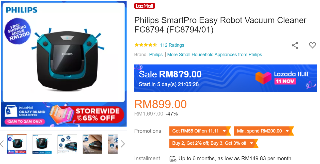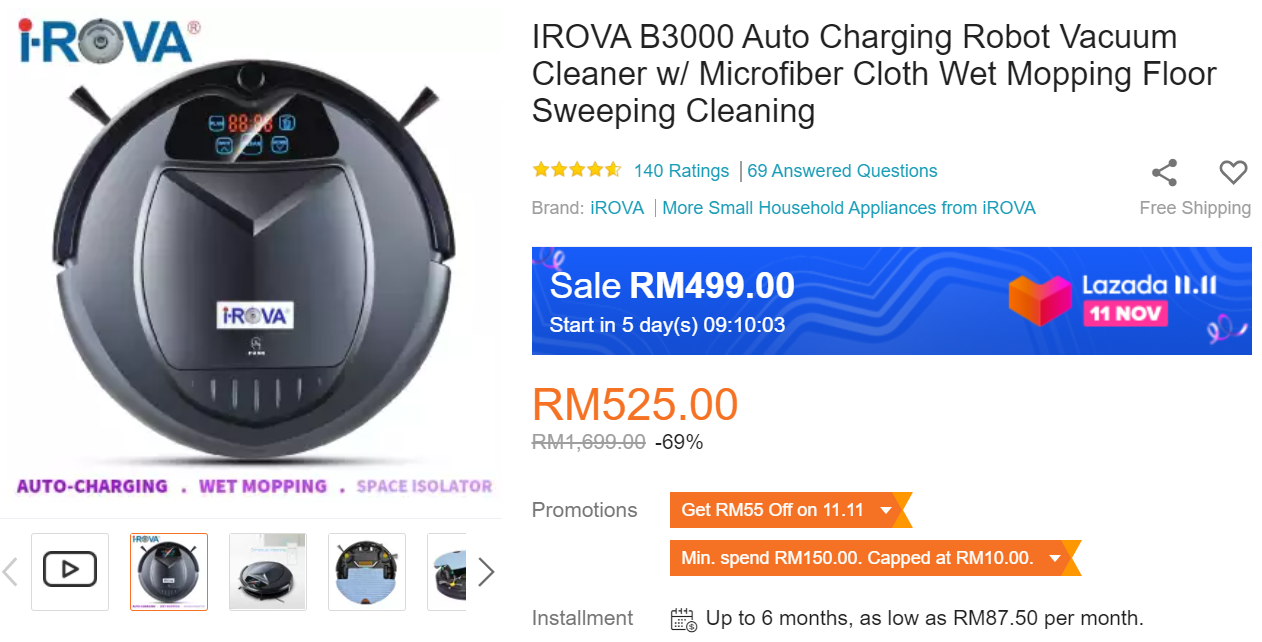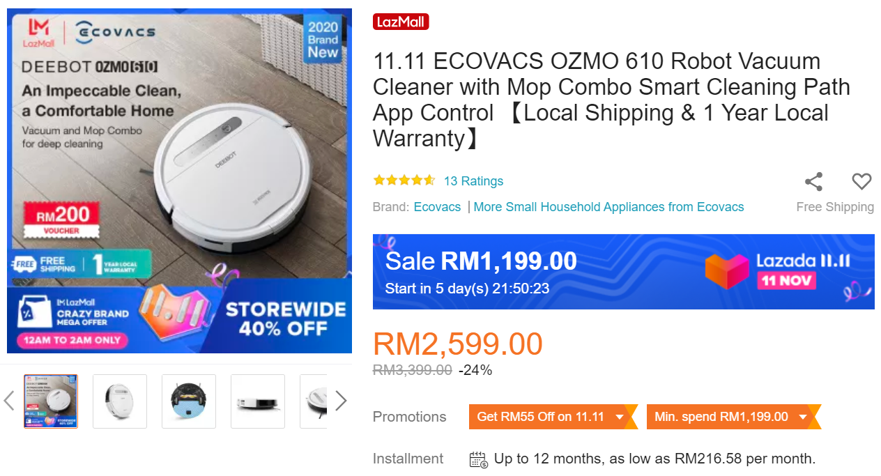 11.11当天,各大家电品牌的 Lazada 网店以及 Lazada TecMall 都分别推出大促销,扫地机器人通通都有折扣,而且折扣多达 RM2,300!现在赶快来看看吧!