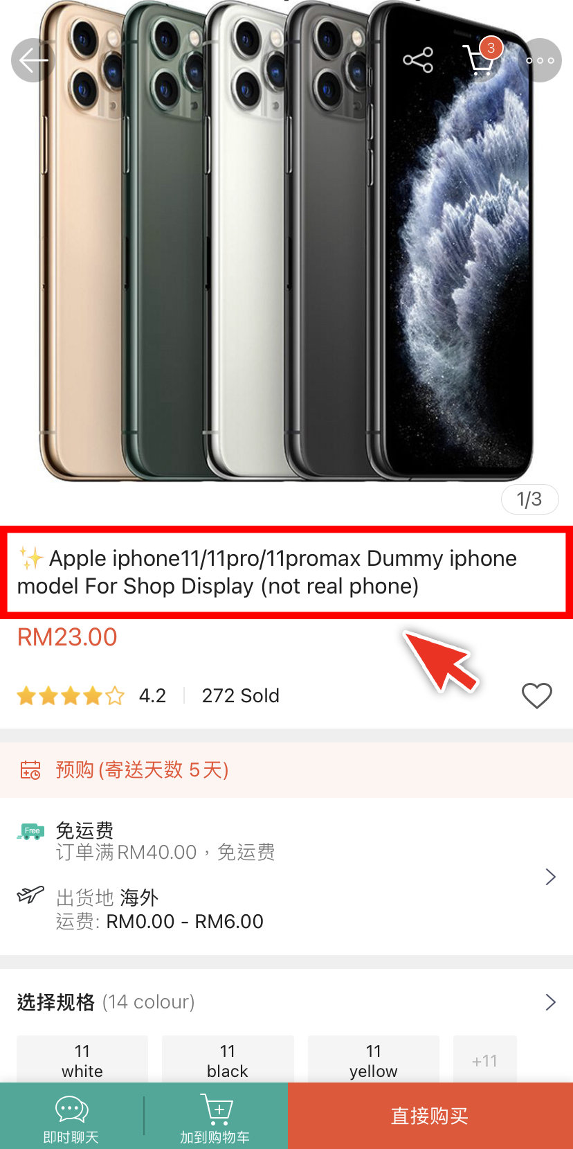 ▼ 卖家在商品的品名里已经清楚地注明:这些 iPhone 11 系列手机都是用于店内展示的模型,不是真正的手机,售价仅需 RM23。