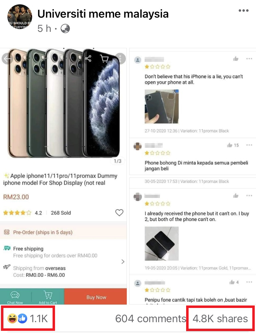 今天大马一个面子书专页上载分享照片立刻引起热烈讨论以及疯传,一名卖家在购物平台售卖用于展示的 iPhone 11 系列“假手机”,结果无辜被买家们骂翻!