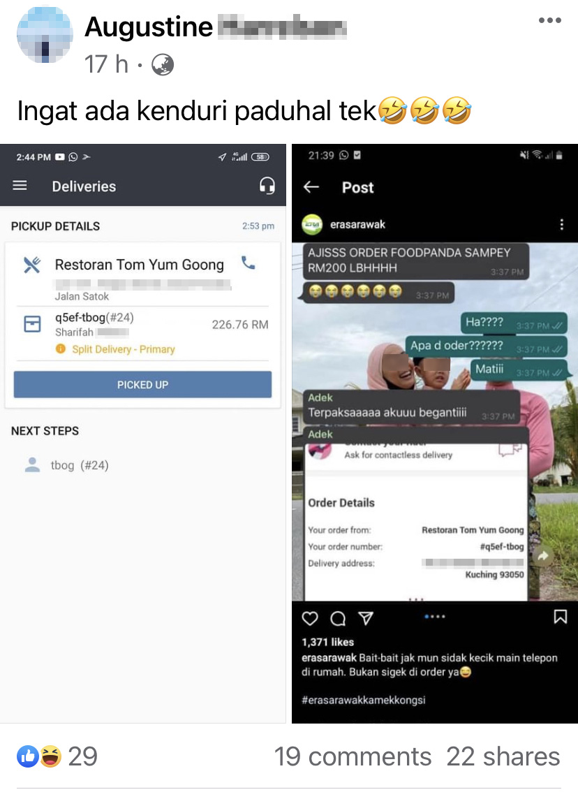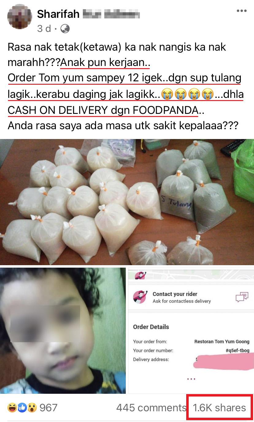 这位大马妈咪近日在面子书发文,无奈地写道:「觉得好笑但又想哭,还是要生气好呢?孩子真是没空… 他用 FoodPanda 点了12包Tom yum汤,还有牛骨汤、Kelabu… 最后还按了货到付款(cash on delivery)!你们觉得我还有时间头痛吗???」
