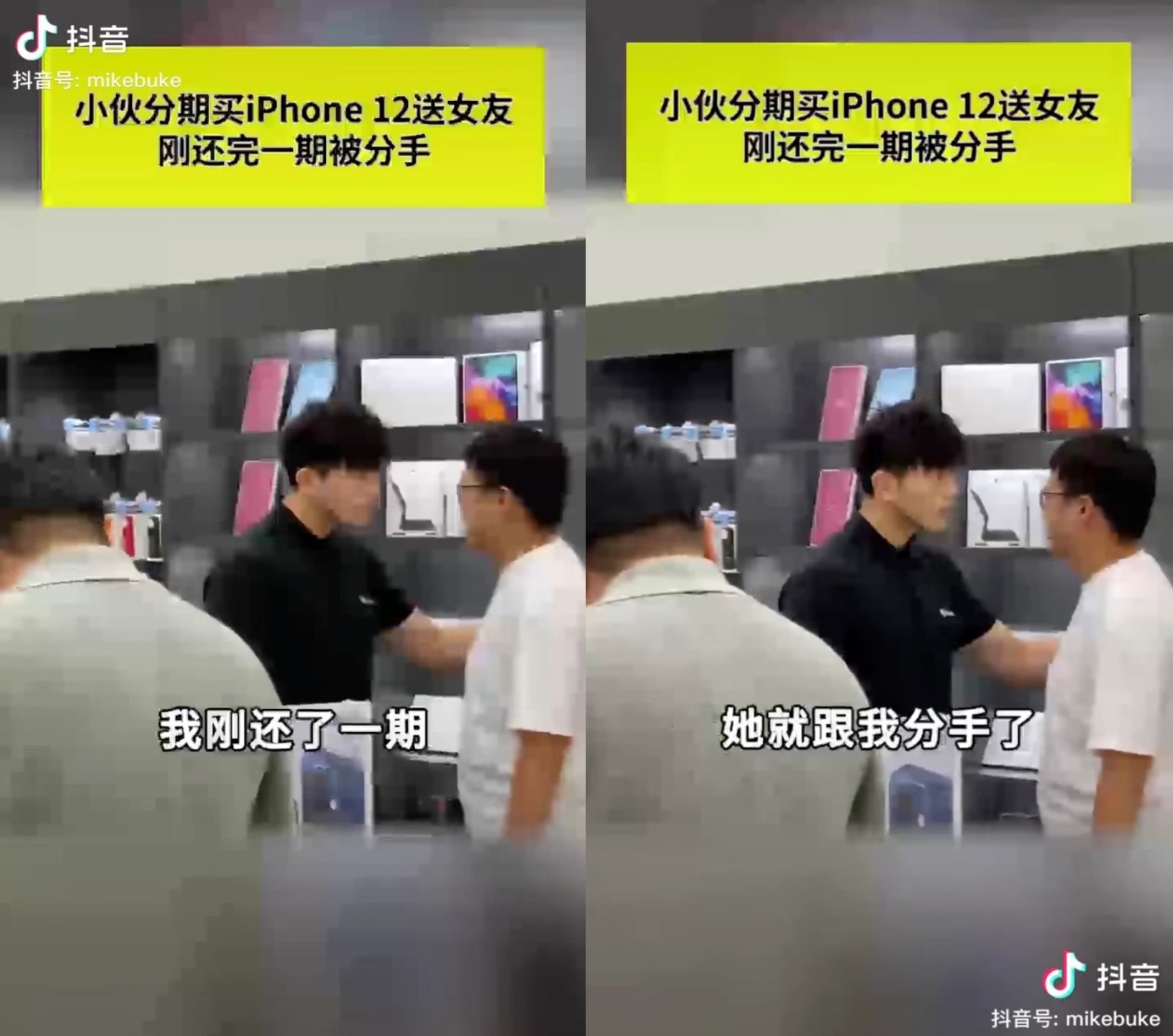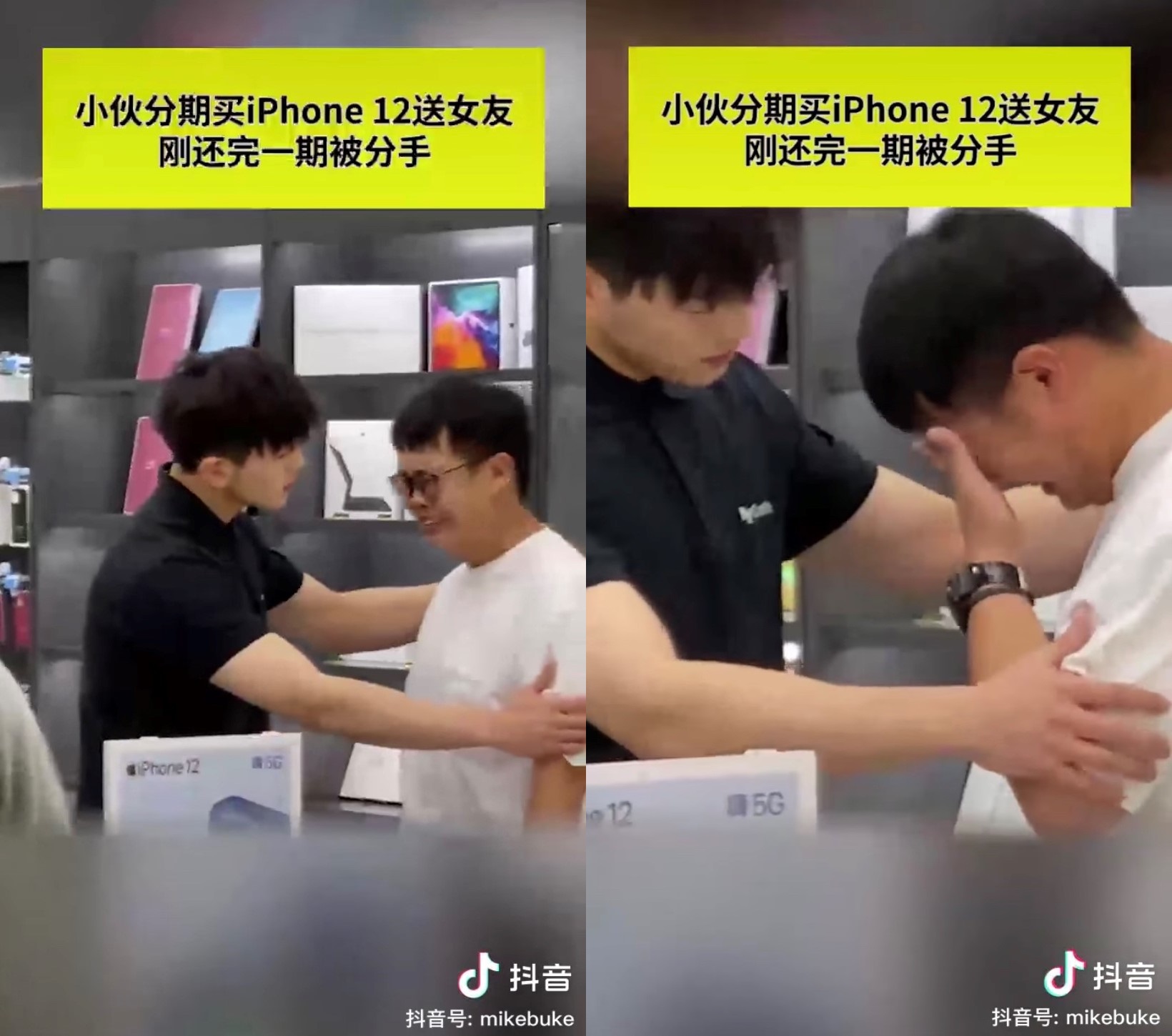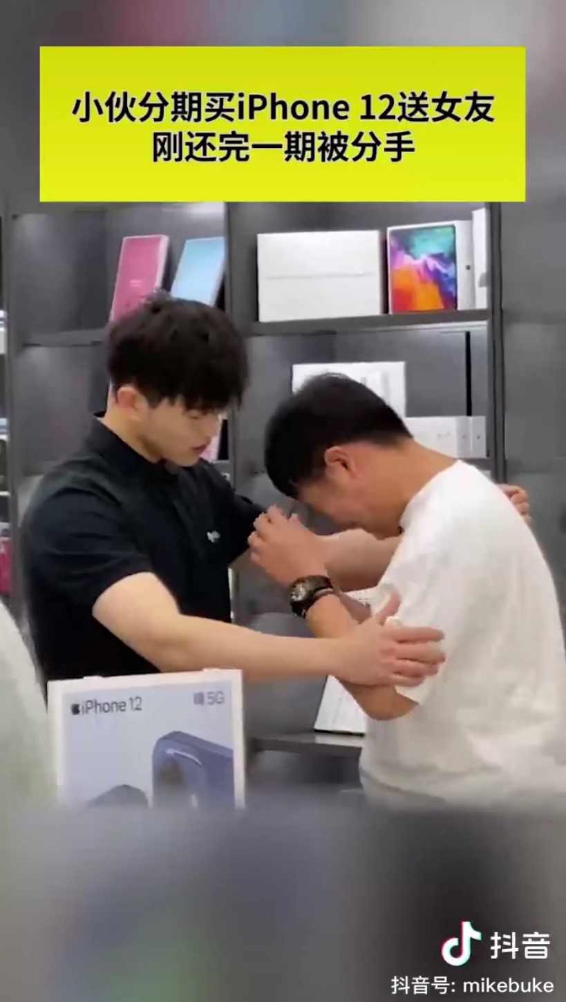 ▼ 男子在店里崩溃爆哭,委屈地跟男店员吐苦水说:「我给我女朋友买 iPhone 12,我分12期,我刚还了一期,她就跟我分手了!」