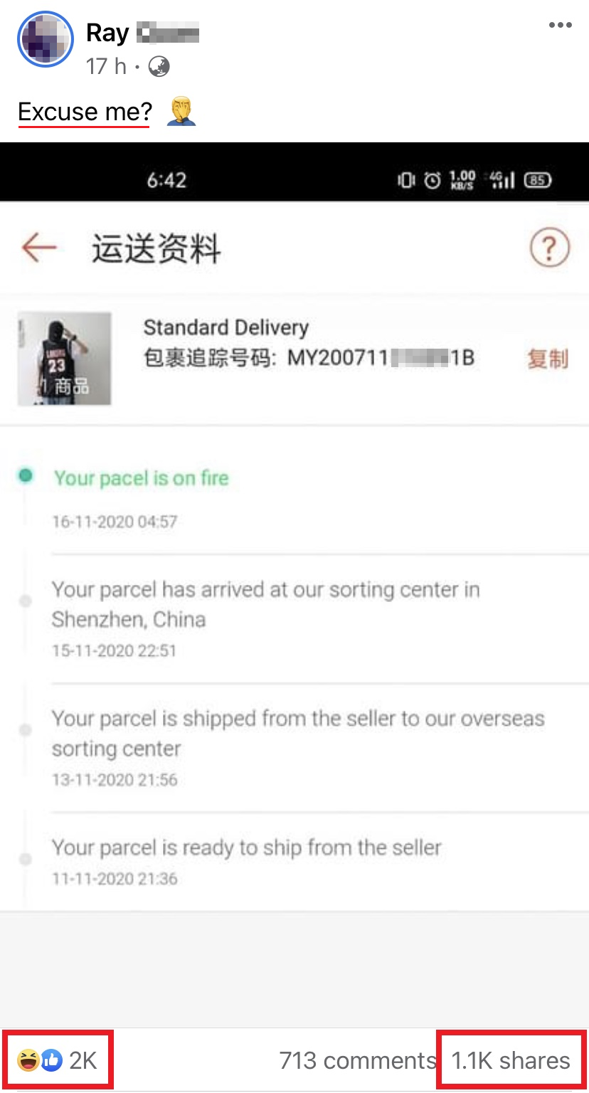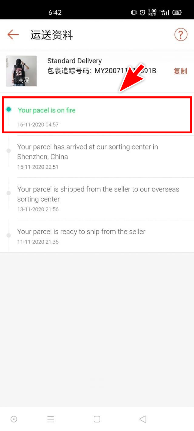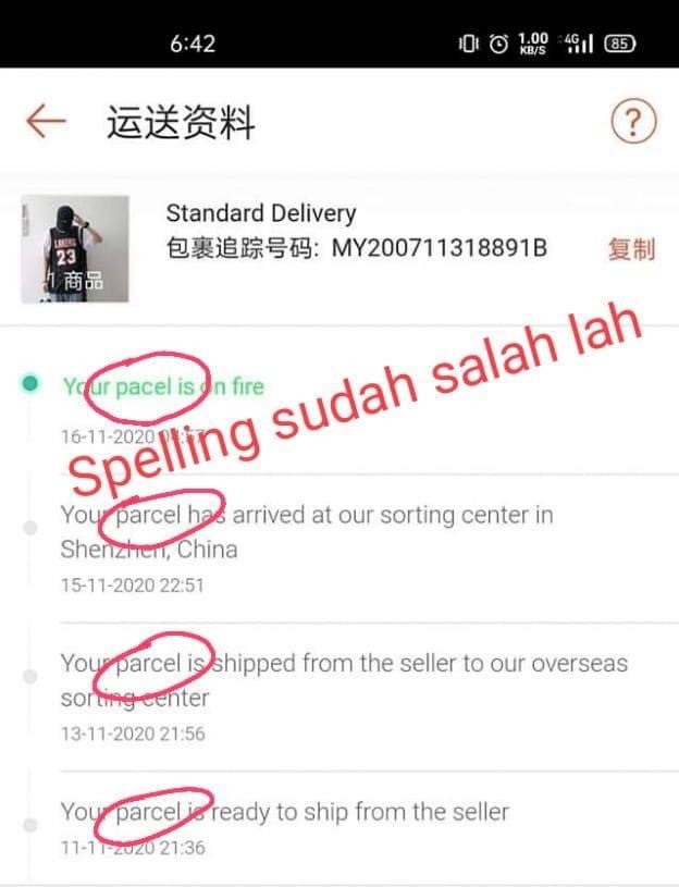 随后,一名大马男子就在“吹水站”分享一张手机截图,照片中显示购物 App 的“运送资料”,最新动态竟然是英文版的「您的包裹正在燃烧(on fire)!」网友们看了以后都忍不住大笑:这个真的是GG了!