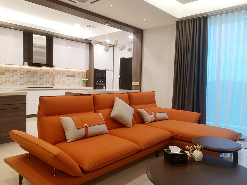 这个沙发呢,也是去看过很多间,就是没有很喜欢那种。想说电视机这么脆弱都下单了,餐桌,沙发怎么不下单,所以买!我们选择这款,适合小孩子,旁边左右可以调整,可以当枕头躺着。加上我们大胆选择了这个颜色。