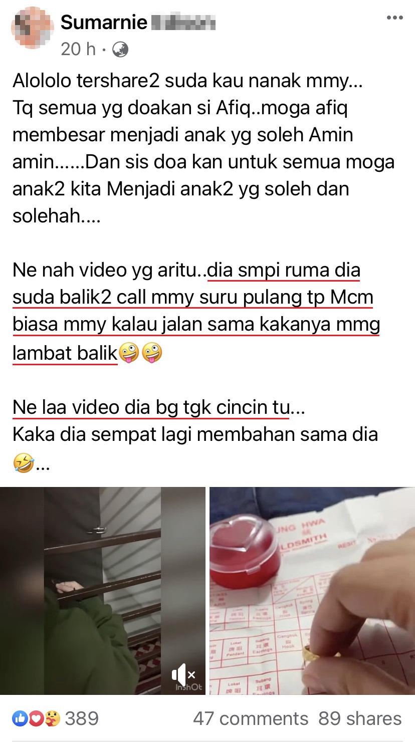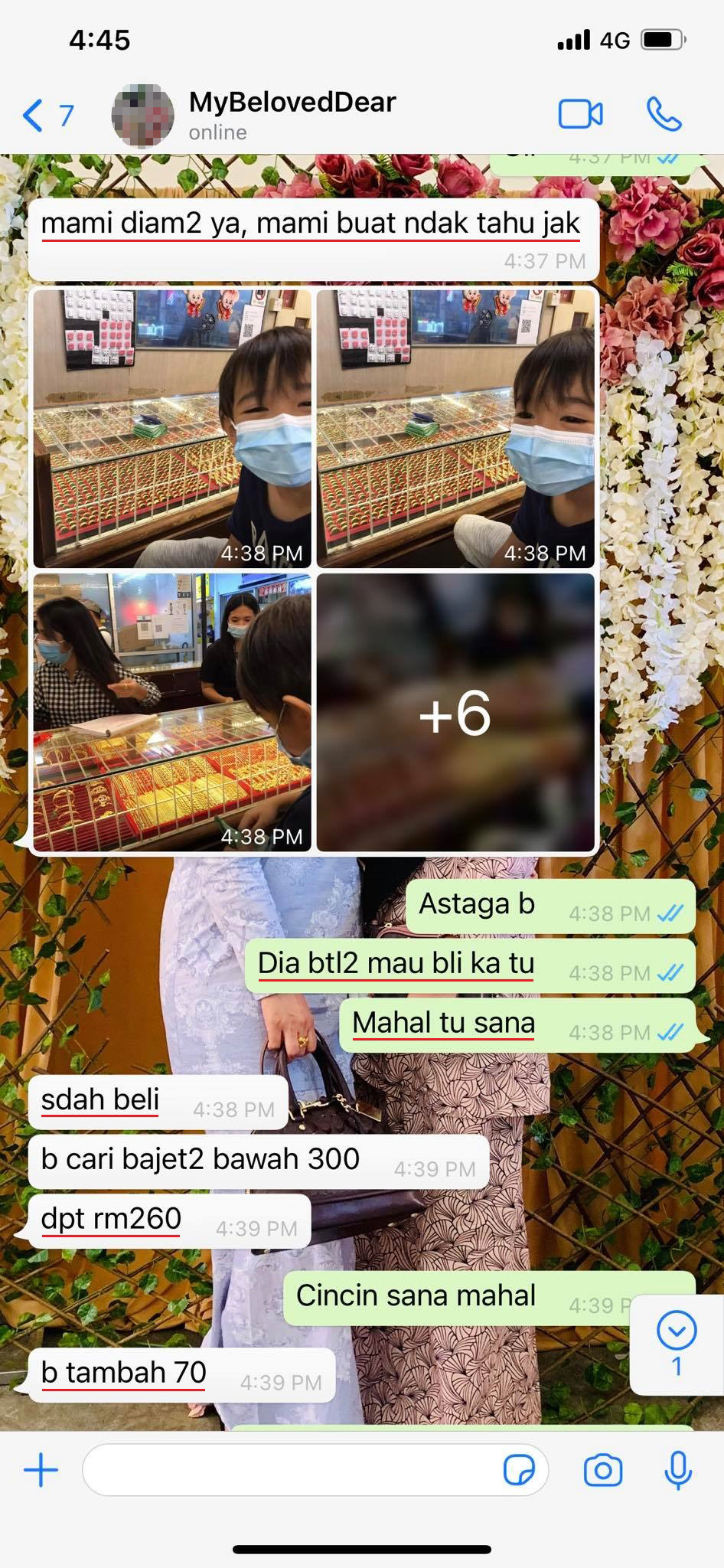 ▼ 爸爸看着儿子在为妈妈挑选礼物的温馨画面,忍不住发照片先告诉妈妈。爸爸写道:「我们的预算是RM300以内,最后选了一个 RM260的戒指,我还帮他补贴了RM70。」