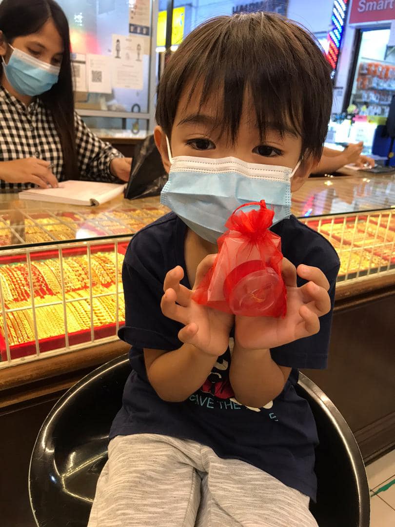 这是他生日时得到的礼物钱,他存了下来。刚才孩子的爸爸带他和哥哥去剪头发,前面有一间卖金饰的店铺,他就叫爸爸带他进去。