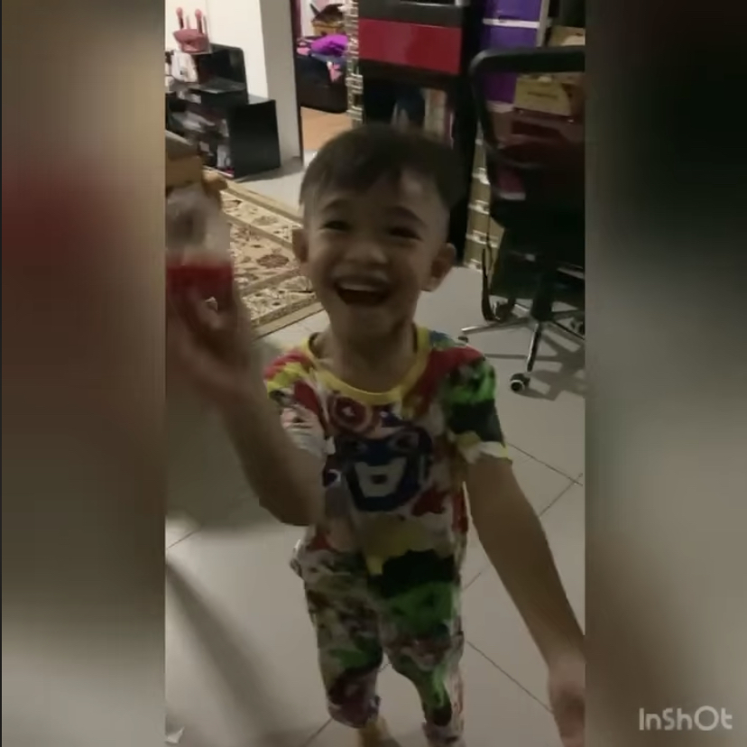 该帖子在网上爆红以后,昨天小男孩的妈妈再次在面子书发文更新,分享了儿子送礼物的视频,超可爱的!