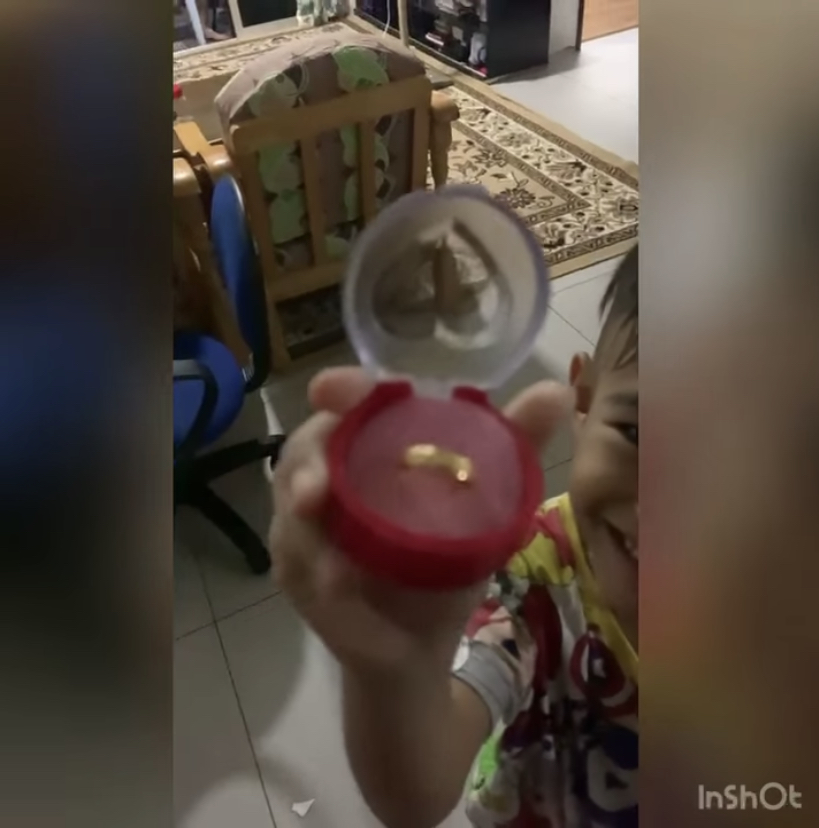 ▼ 小男孩的手上拿着戒指盒要送给妈妈,天真无邪的笑容融化了网友们的心!
