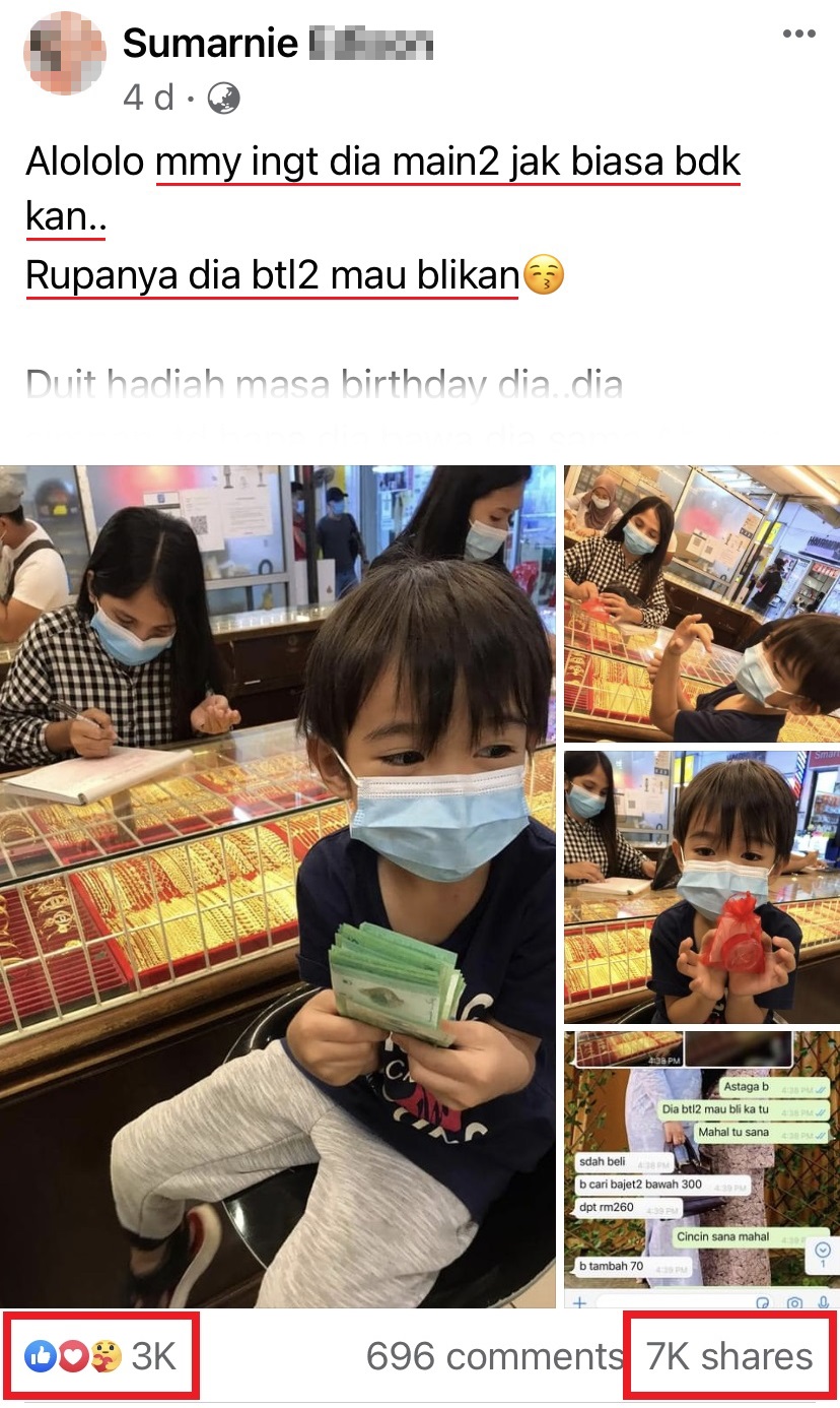 然而这名大马男童却和其他小朋友不同,他把他仅有的钱都用于买礼物送妈妈,超级暖心!妈妈将此事分享在社交媒体,短短几天内,已经累计多达7,000次分享和3,000人点赞!