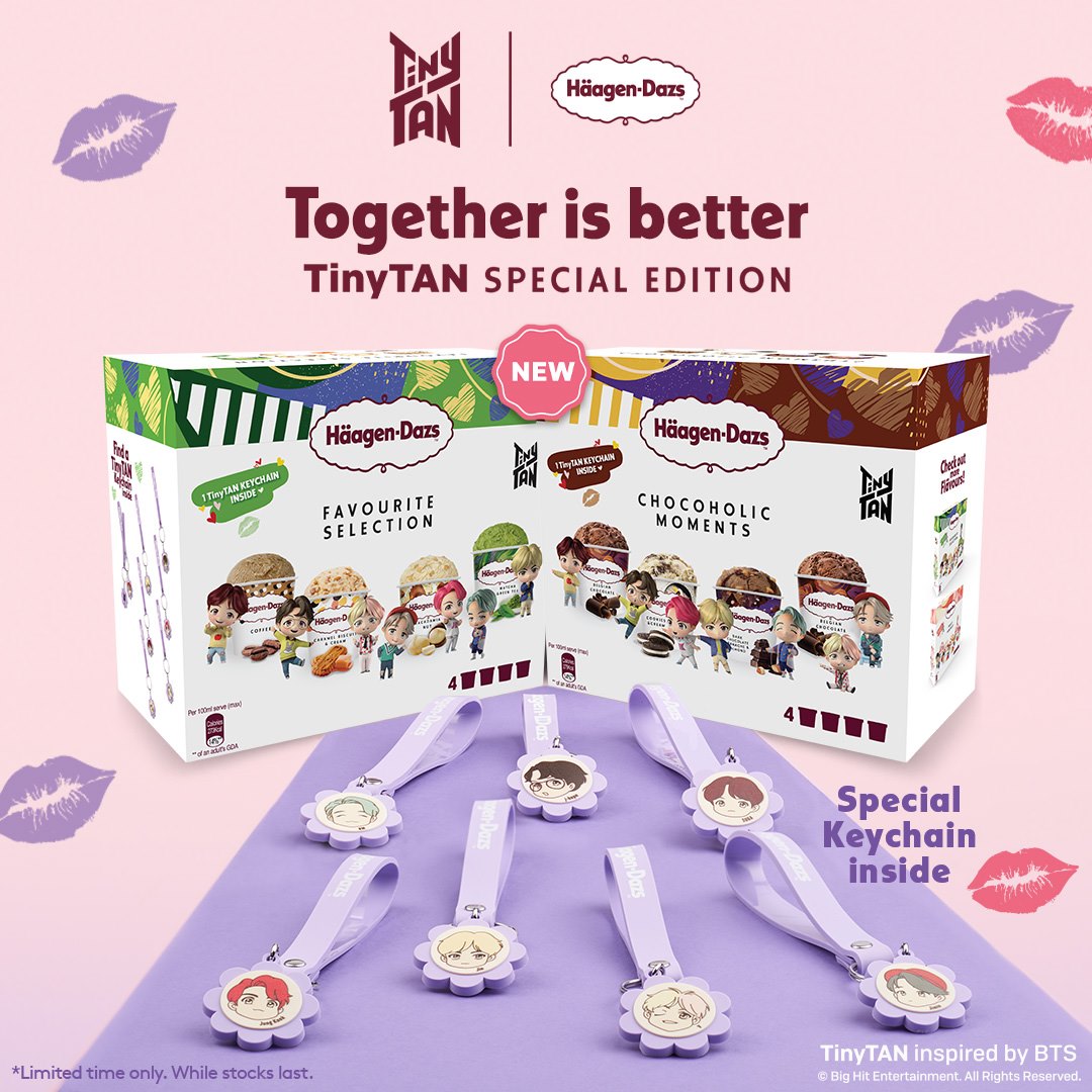 只要你在各大指定超市就可购买到这款Haagen Dazs 推出BTS 主题冰淇淋礼盒!且附送一个精美限量版TinyTAN 成员钥匙圈!数量有限,先买先得!