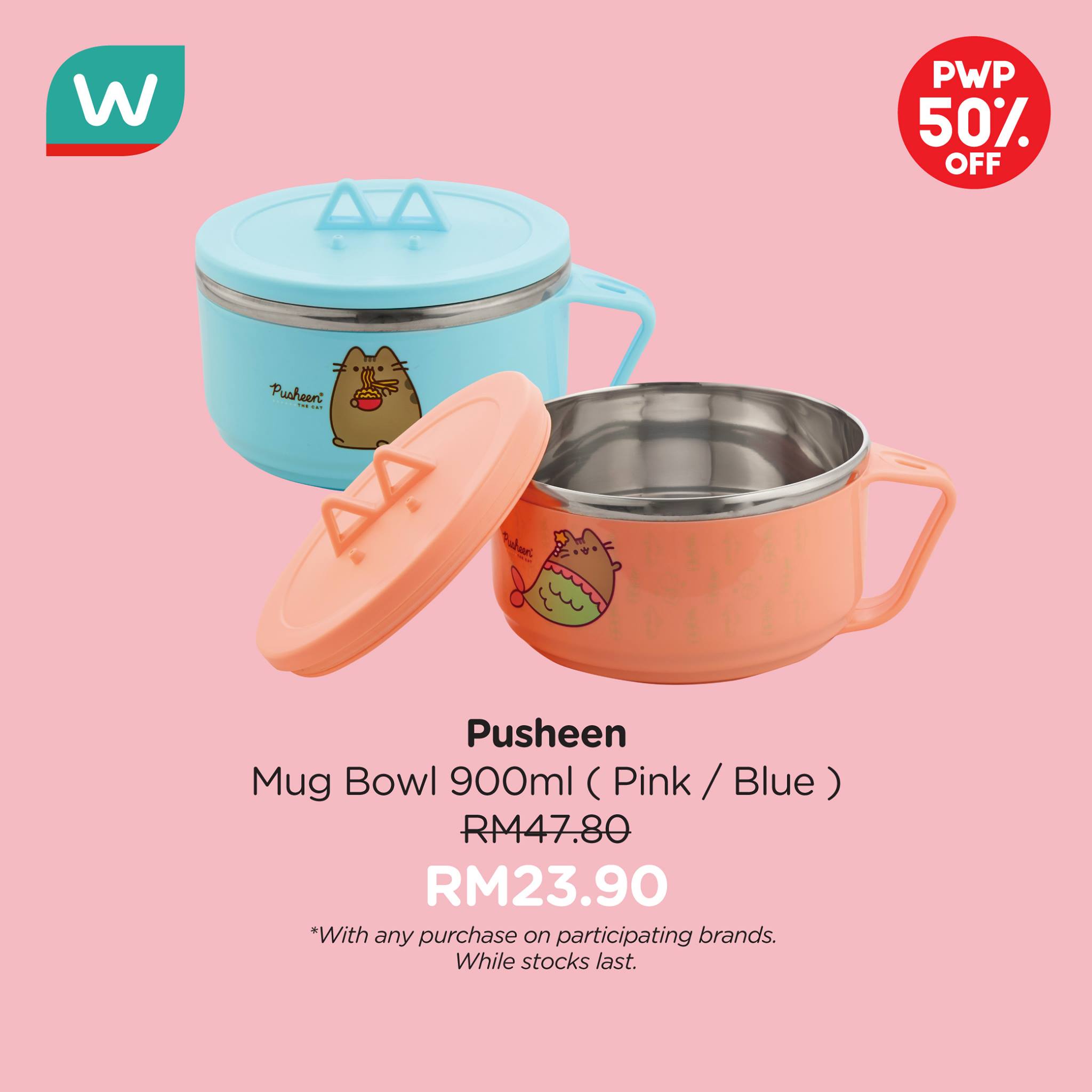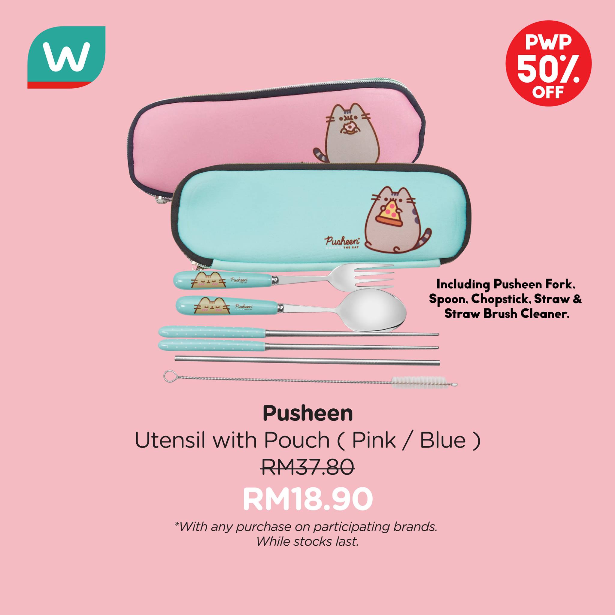 只要你购买指定品牌的商品,就可享有50%折扣优惠购买Pusheen 系列周边商品,有:多功能迷你电锅,马克碗,水瓶,餐具套组,餐垫,卡套,折叠式手机座及折叠式带套包包!