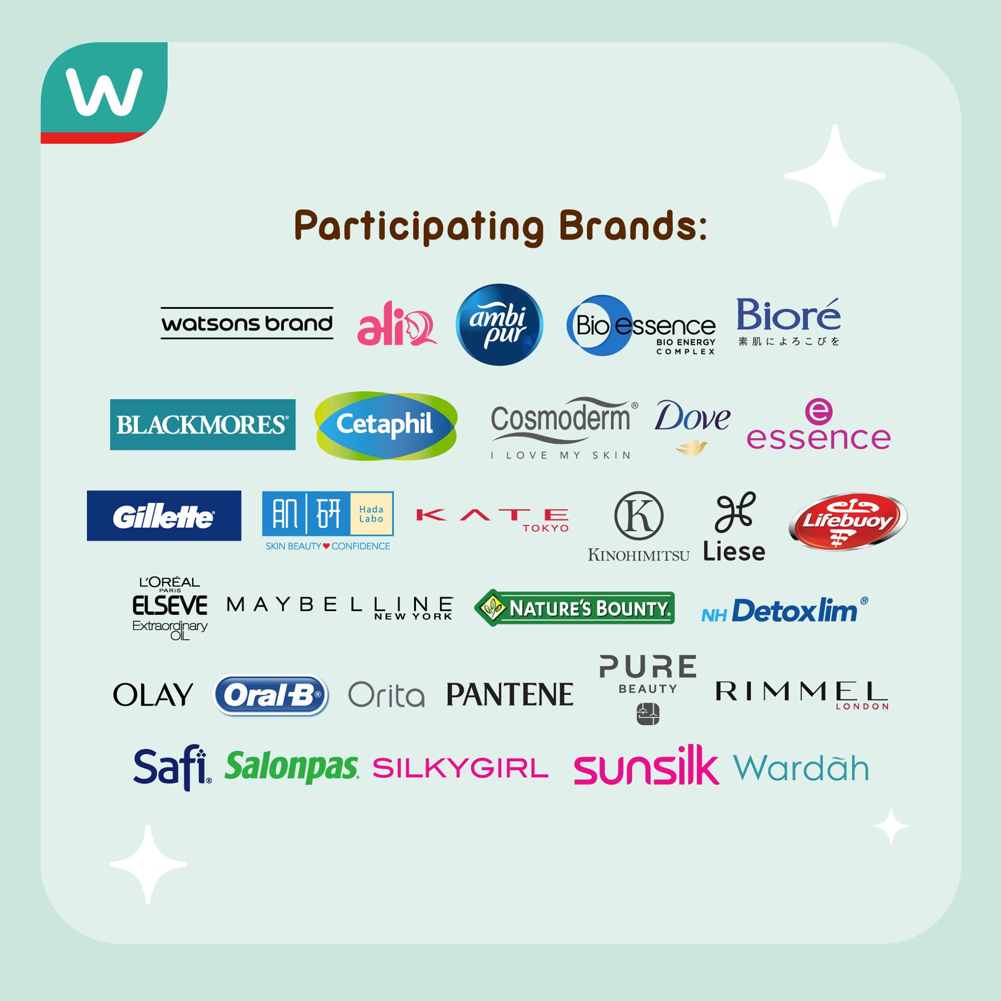 ▼ 参与合作品牌:Watsons Brand、Ambi pur、Biore、Bio essence、Dove、Maybelline等等!