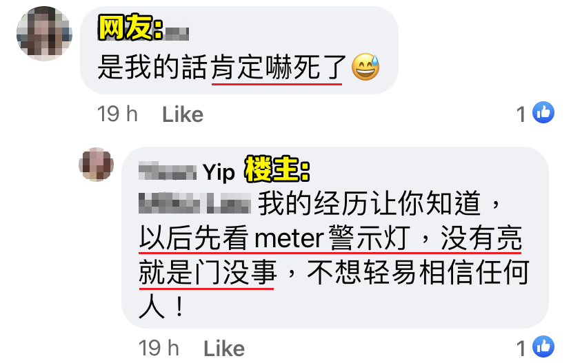 他指着我的门,要骗我说我的门没关紧,还试图开我的门!我差点就想去按开门键,但是我突然觉得不对劲,马上望向我的 meter 表,我的“车门警示灯”并没有亮着,所以我非常肯定我的门没有问题!是他有问题!