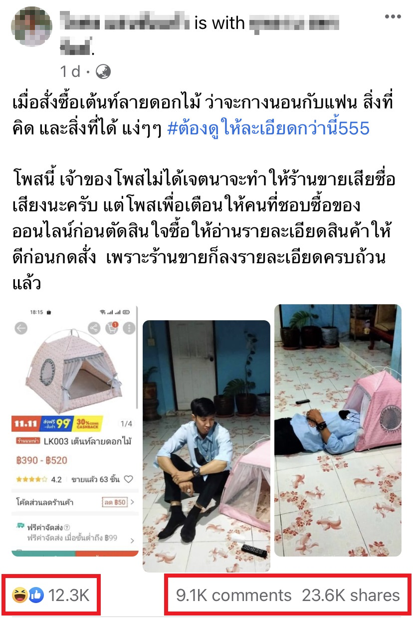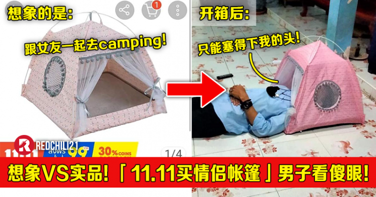 泰国一名男子日前在面子书发文抱怨,在双十一大优惠的时候网购了一顶情侣帐篷,结果收到货的时候他懵了!