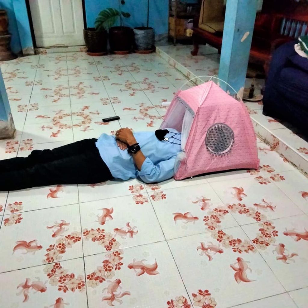 男子说,收到帐棚的当下他不停地揉揉眼睛,以为是自己看错了!「怎麽会这麽小?小到只能把头放进去,这应该是给小猫、小狗睡觉用的帐篷吧!」