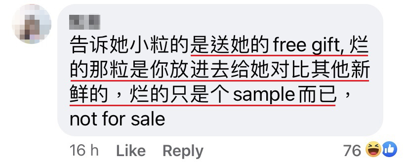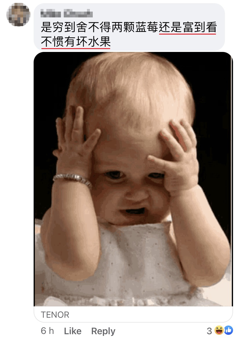 ▼ 该名女奥客用 WhatsApp 发了一张水果腐烂的照片给贴主,并投诉说:「老板,那天和你买的2盒蓝莓,里面坏了2粒,还有1粒很小粒咯!你跟我说全部大大粒的,为什么这样不标准的?还会坏2粒。」