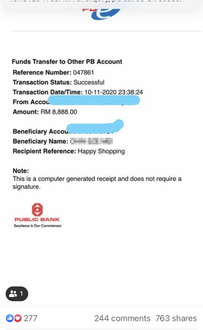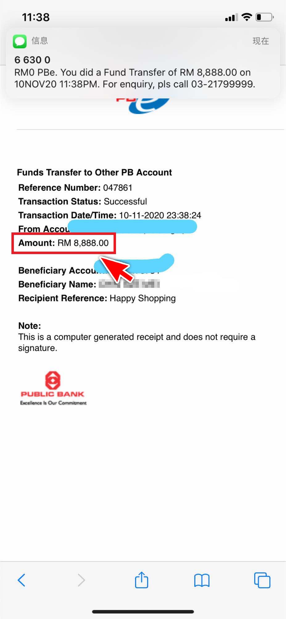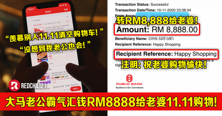 该人妻分享了一张自己的手机截图,从照片中可以看到,老公在双十一的前夕,霸气地转账了RM8,888给老婆,并注明这笔钱是给老婆双十一购物用的:「Happy Shopping!(购物愉快!)」