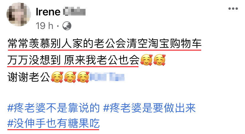 该帖子写道:「常常羡慕别人家的老公会清空淘宝购物车 万万没想到原来我老公也会!疼老婆不是靠说的,疼老婆是要做出来。没伸手也有糖果吃!」