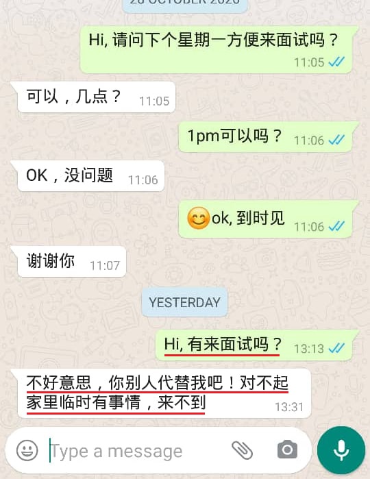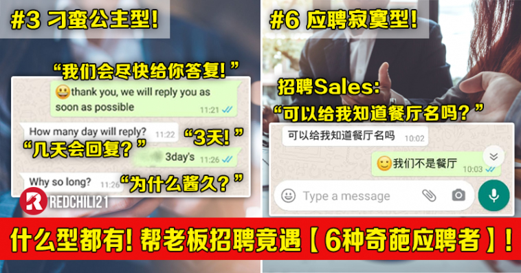 大马女子 Laetitia 发文分享道,最近公司的老板请她帮忙招聘新人,这么一搞才发现原来现在应聘工作的人有这么多“款型”,要什么样的人才都有!Laetitia 除了附上聊天内容,还分别列出了6种不同型的应聘人士。