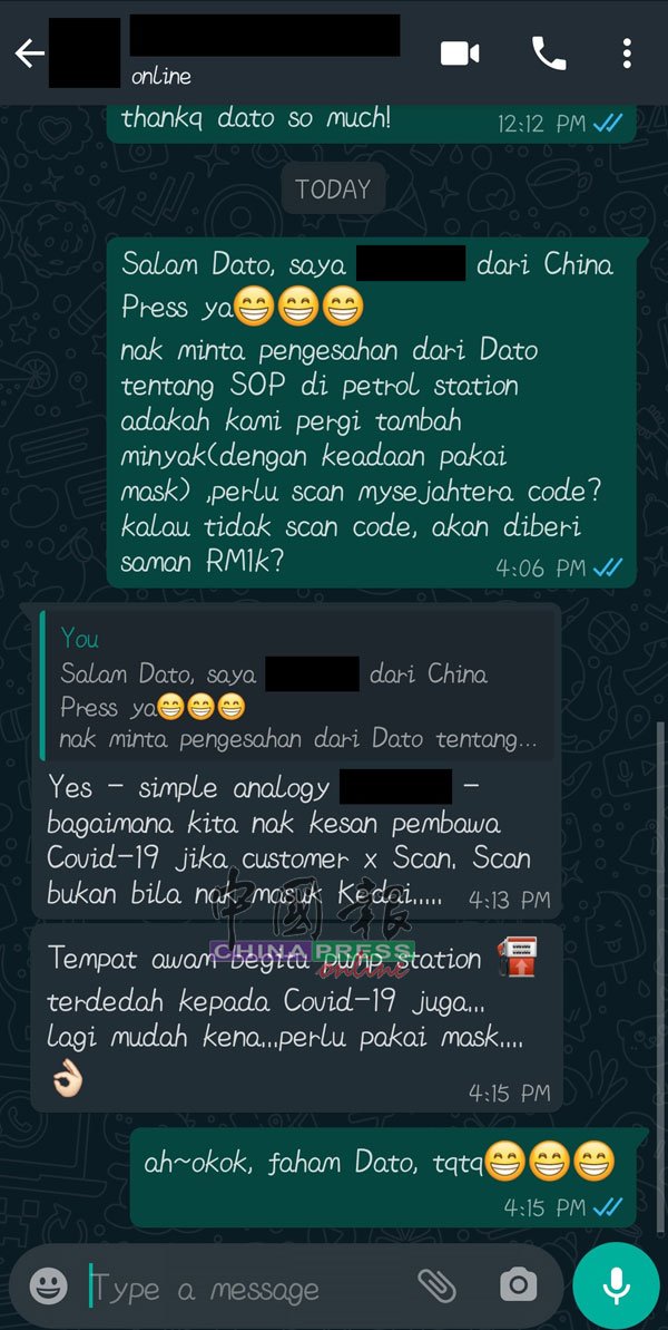 为了了解详情,《中国报》记者亲自联系了武吉阿曼刑事调查局副总监(调查/监控)拿督米奥法立以询问有关这起事件。拿督米奥法立回复说,民众只要到了油站,即使没有进入油站的便利店,只是在外面添油,也必须扫描MySejahtera或登记个人资料,否则将被开罚单。