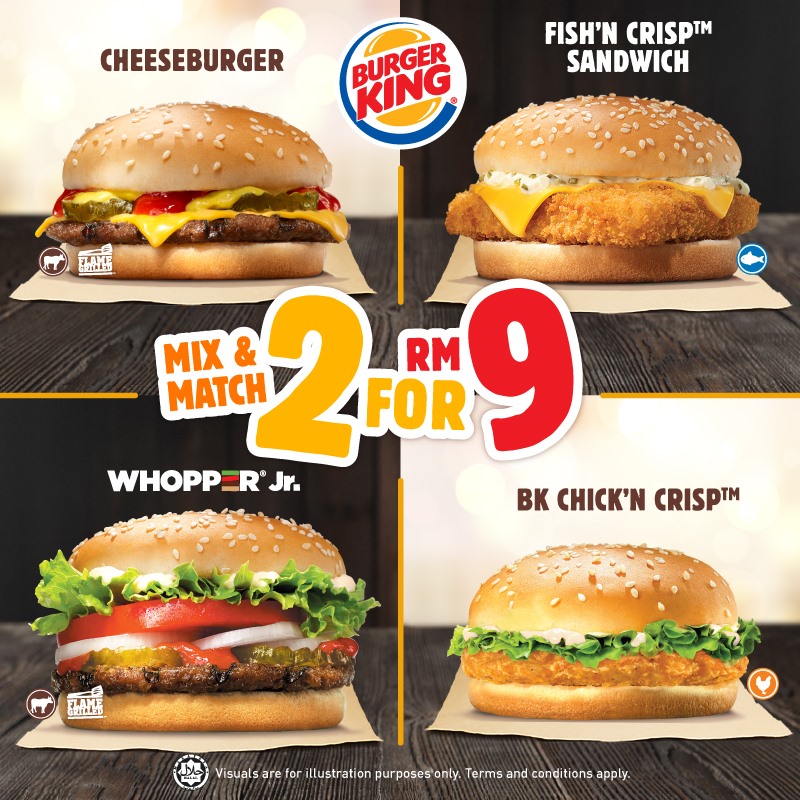 这项优惠从即日起至11月30日,Burger King 推出Mix & Match 任何2粒汉堡只需RM9!平均一粒只需RM4.50!