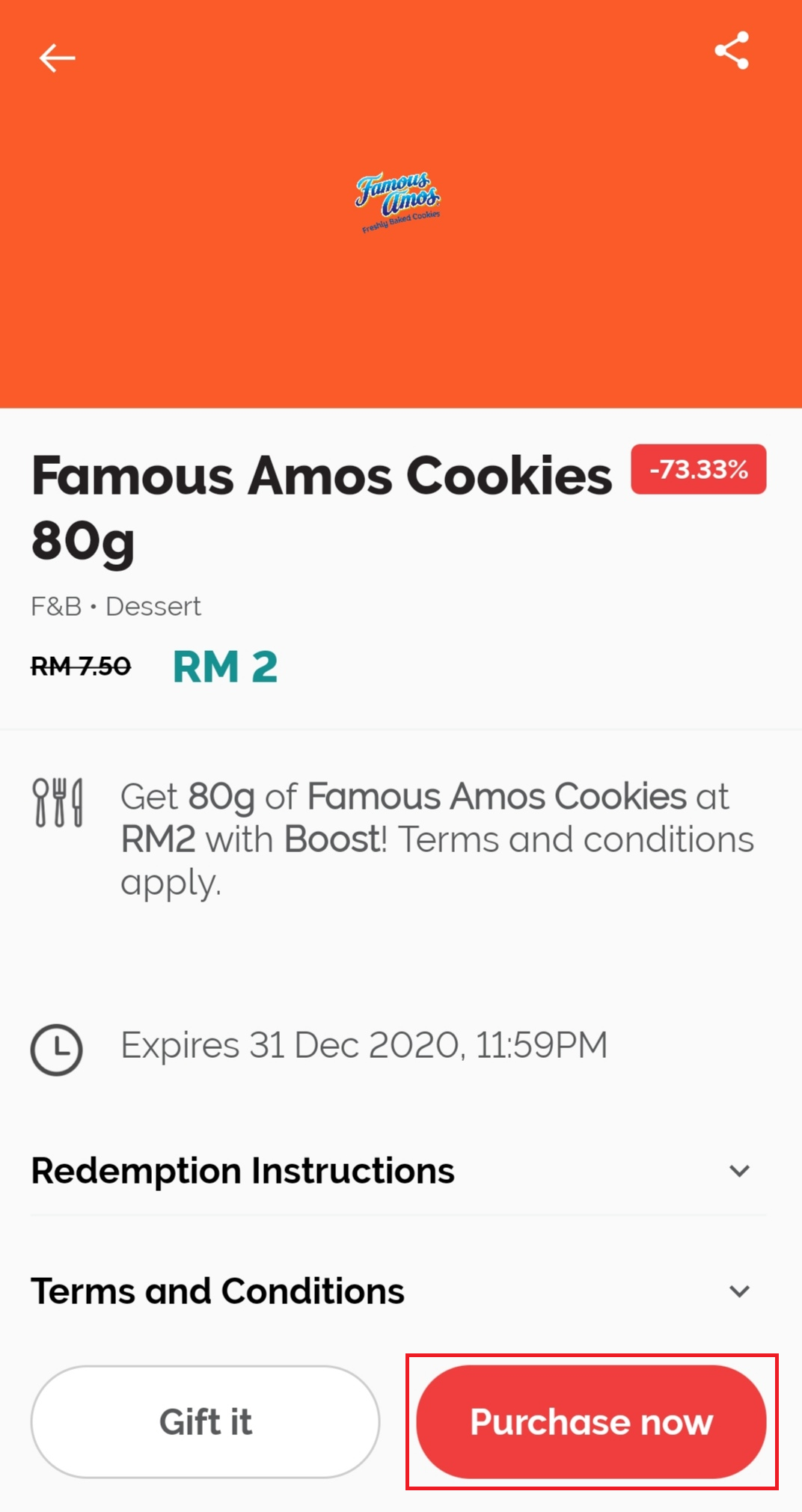 难得一包Famous Amos 曲奇饼只需RM2,赶快打开Boost App 购买优惠券啦!