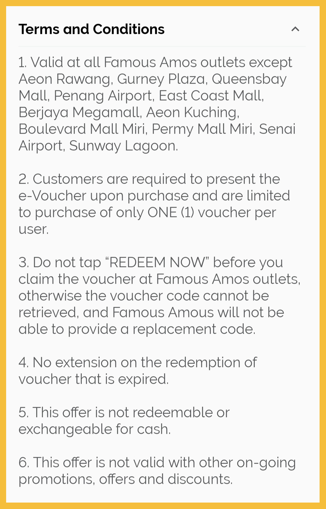 - 可到所有Famous Amos 分店兑换该优惠券(除了Aeon Rawang、Gurney Plaza、Queenbay Mall、Penang Airport、East Coast Mall,Berjaya Megamall、Aeon Kuching、Boulevard Mall Miri、Permy Mall Miri、Senai Airport 及Sunway Lagoon)