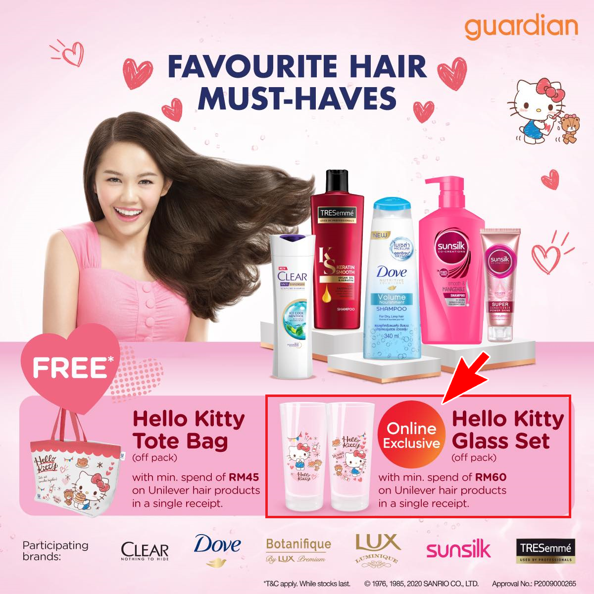 从即日起,只要你在Guardian 购买RM45或以上的指定品牌洗发液或护发素,就能免费获得Hello Kitty 包包!