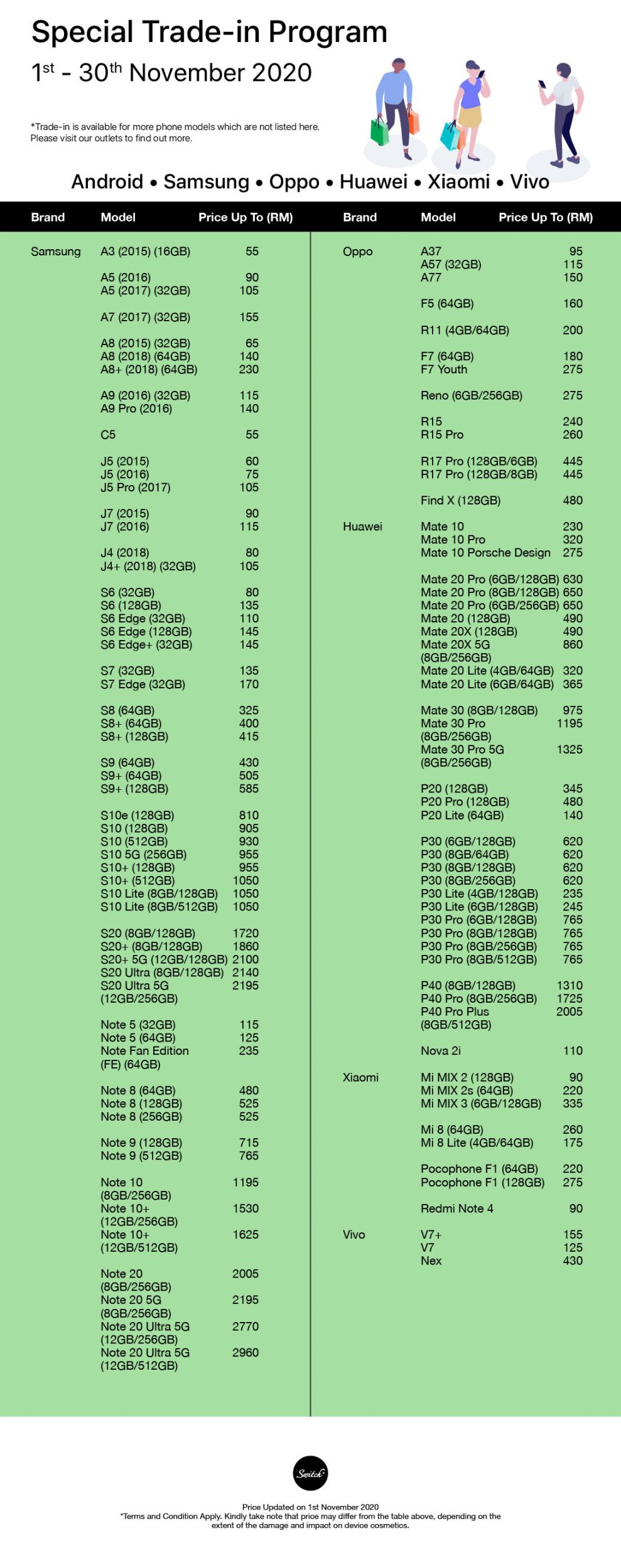 除了可Trade in Apple 手机之外,Android 手机同样也可以: Huawei、Samsung、Oppo、Xiaomi 及Vivo 品牌的手机!