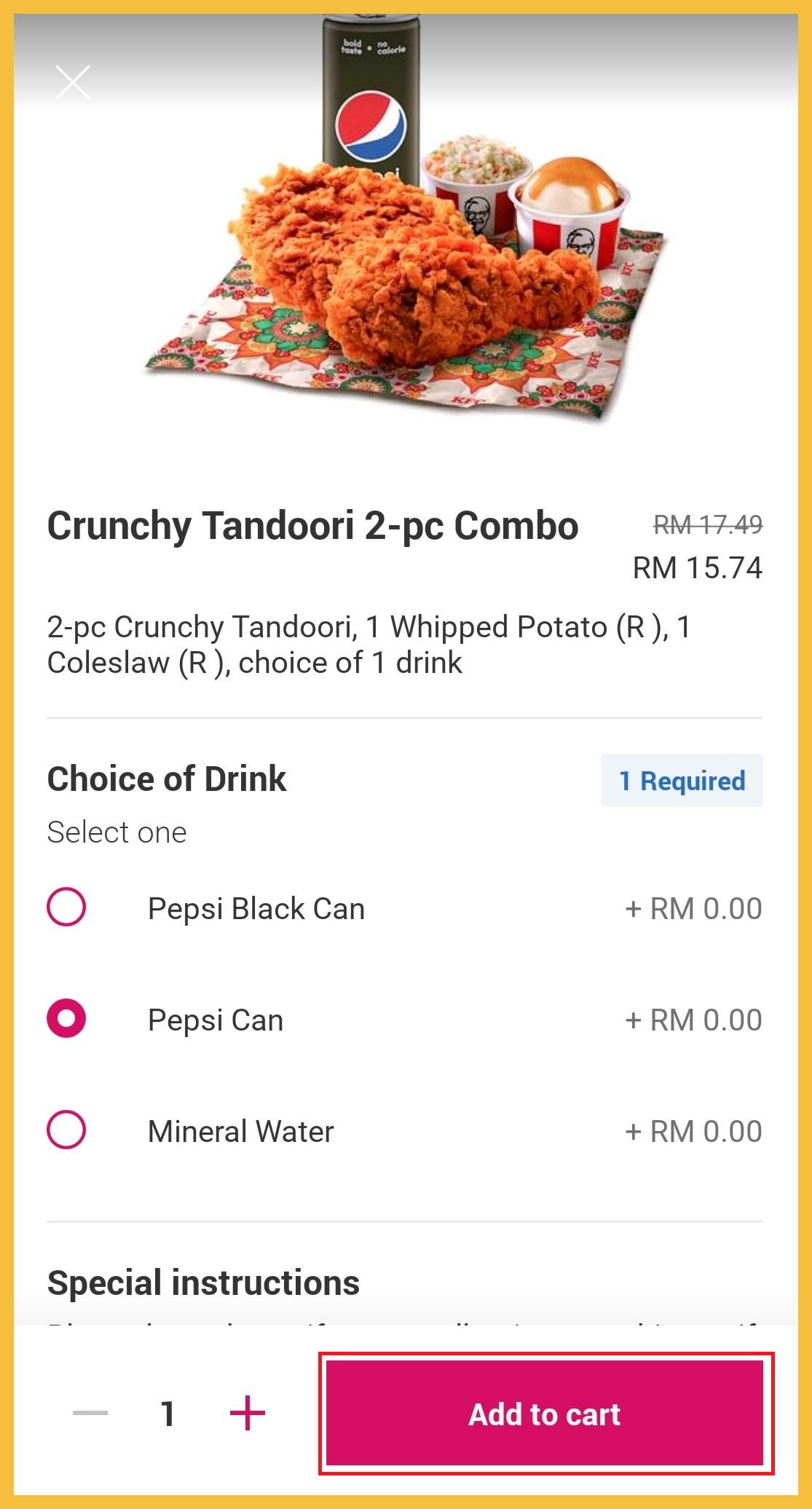 步骤2:选择你美食或套餐,例如:Crunchy Tandoori 2-pc Combo!